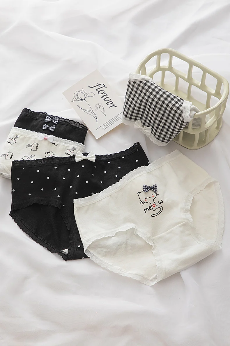 Японское простое черно-белое нижнее белье с принтом кошки, Женские ...