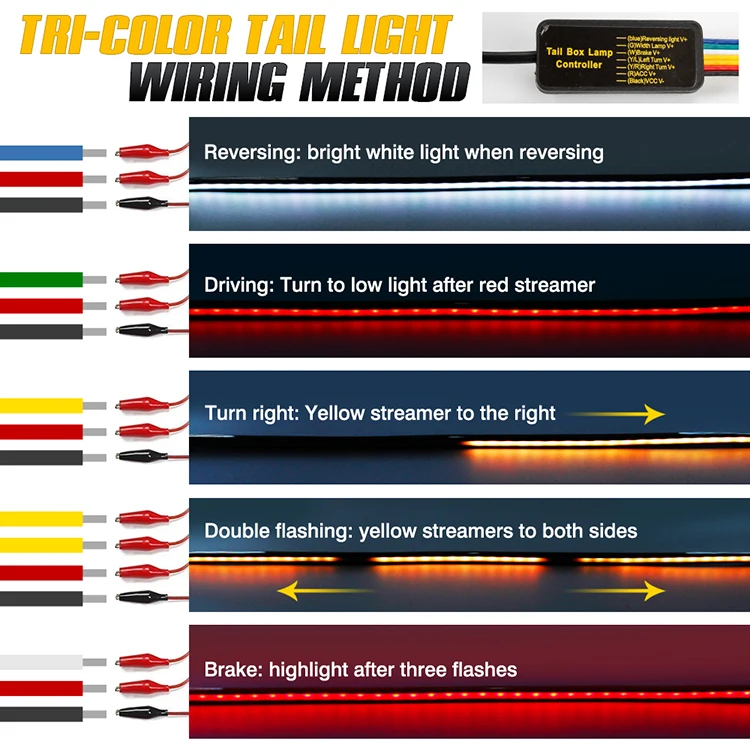 Фирменное наименование: OKEENНапряжение: 12 ВПрименимость: универсальный автомобильЦвет света: белый, желтый, красныйФункция: вождение, двойная вспышка, сигнал поворотаПрименение: автомобиль спойлер, багажник автомобиля губы крыло