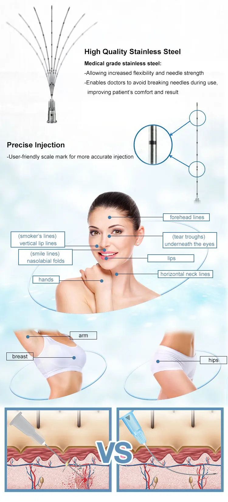 Тупый канюль позволяет использовать кровеносные сосуды, так как микроканюла движется вокруг ткани под кожей вместо того, чтобы прокалывать кровеносные сосуды, как с традиционными иглами. Безопасность от травм нервов