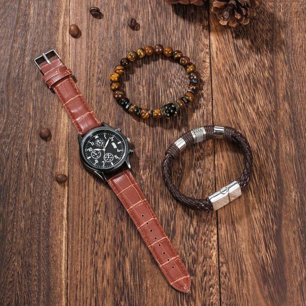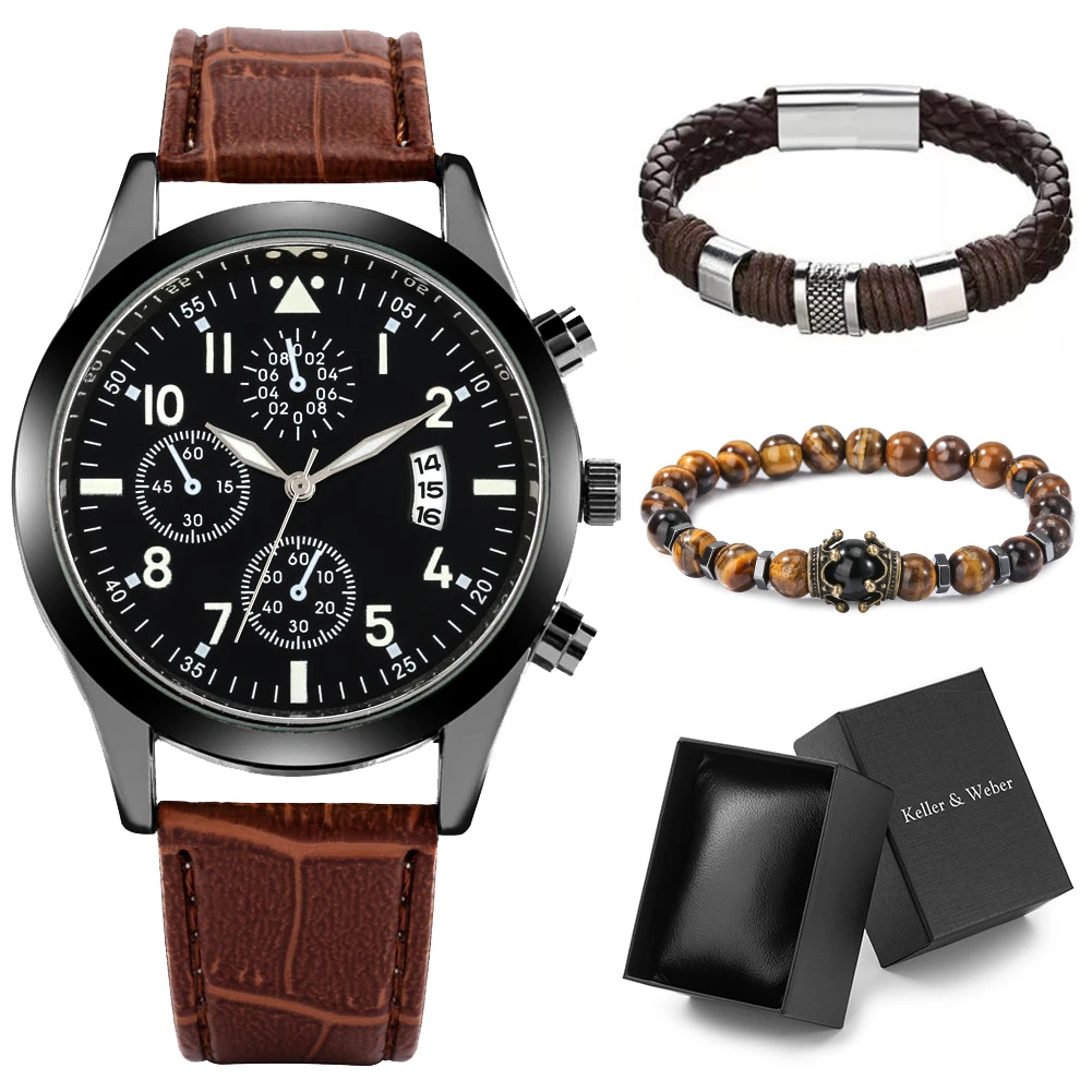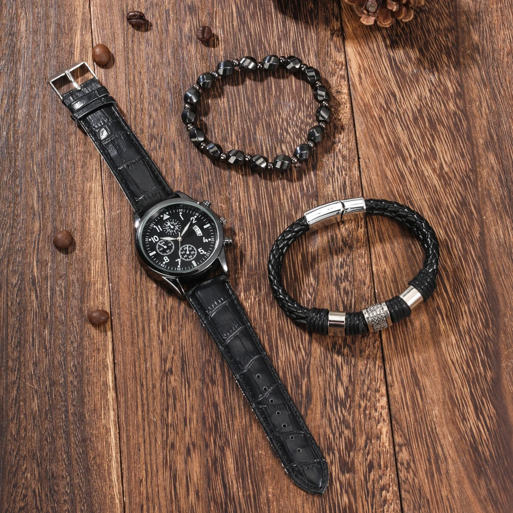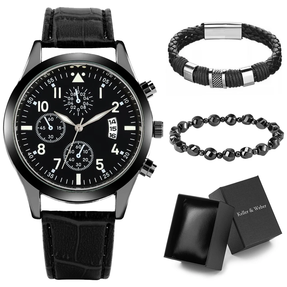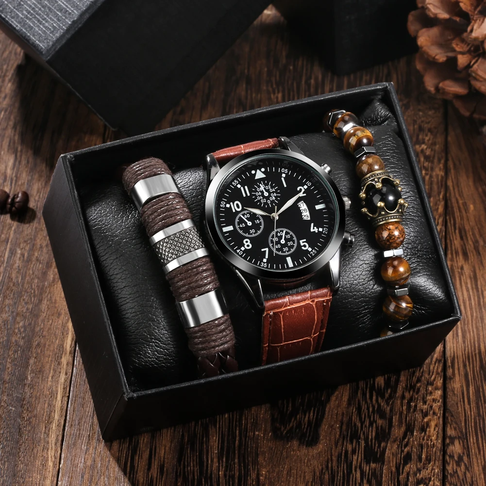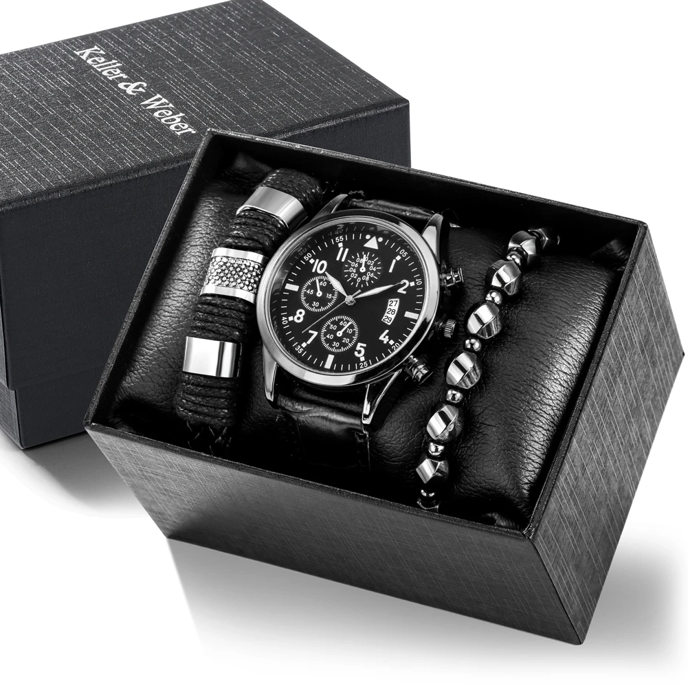 Деловые подарки, мужские кварцевые часы с автоматической датой и браслетом из 2 частей, мужские наручные часы с кожаным ремешком, роскошная черная подарочная коробка