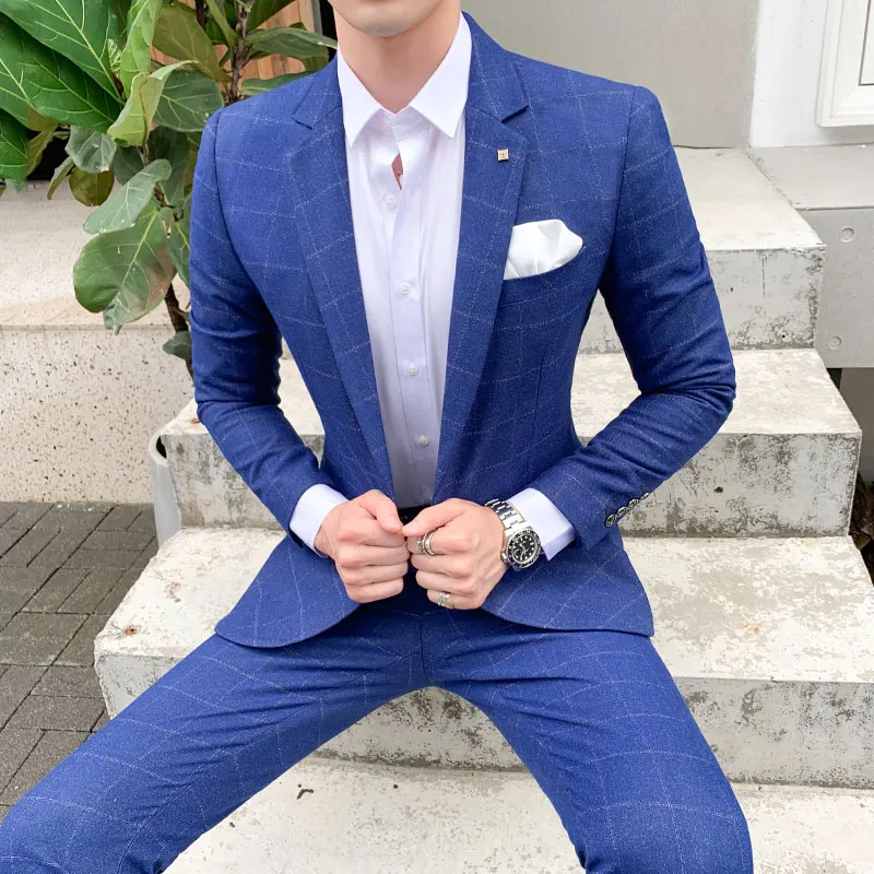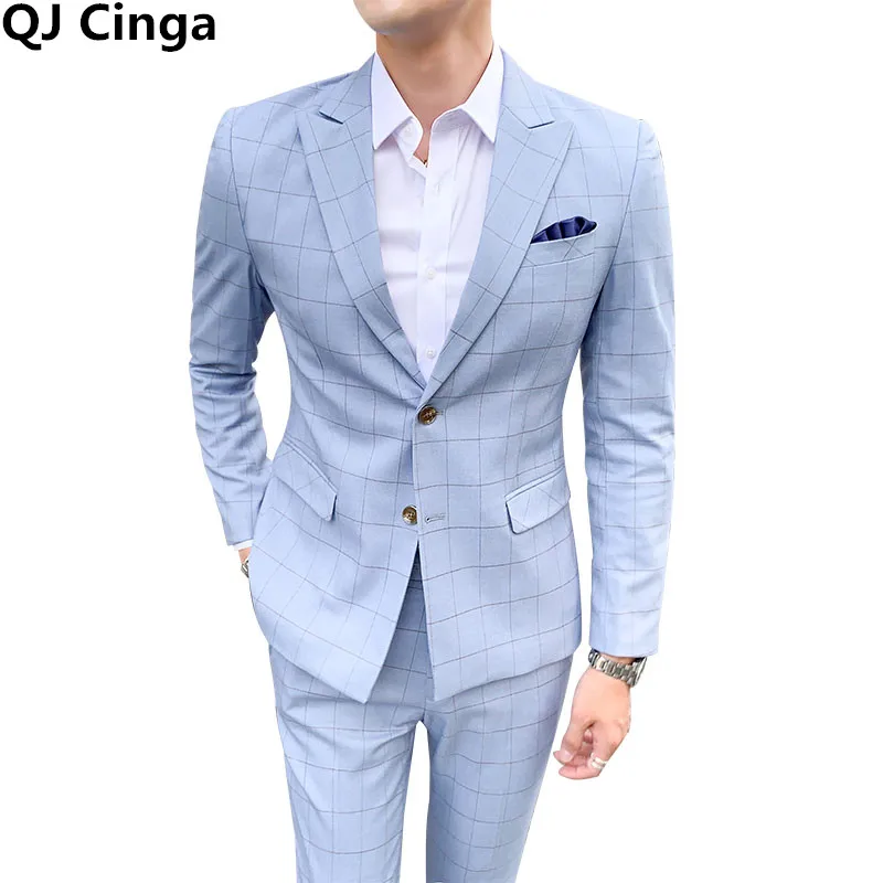 Осенне-зимний новый Небесно-Голубой клетчатый костюм из 2 предметов (пиджак + брюки) деловой офисный костюм Terno Masculino модный приталенный костюм для мужчин