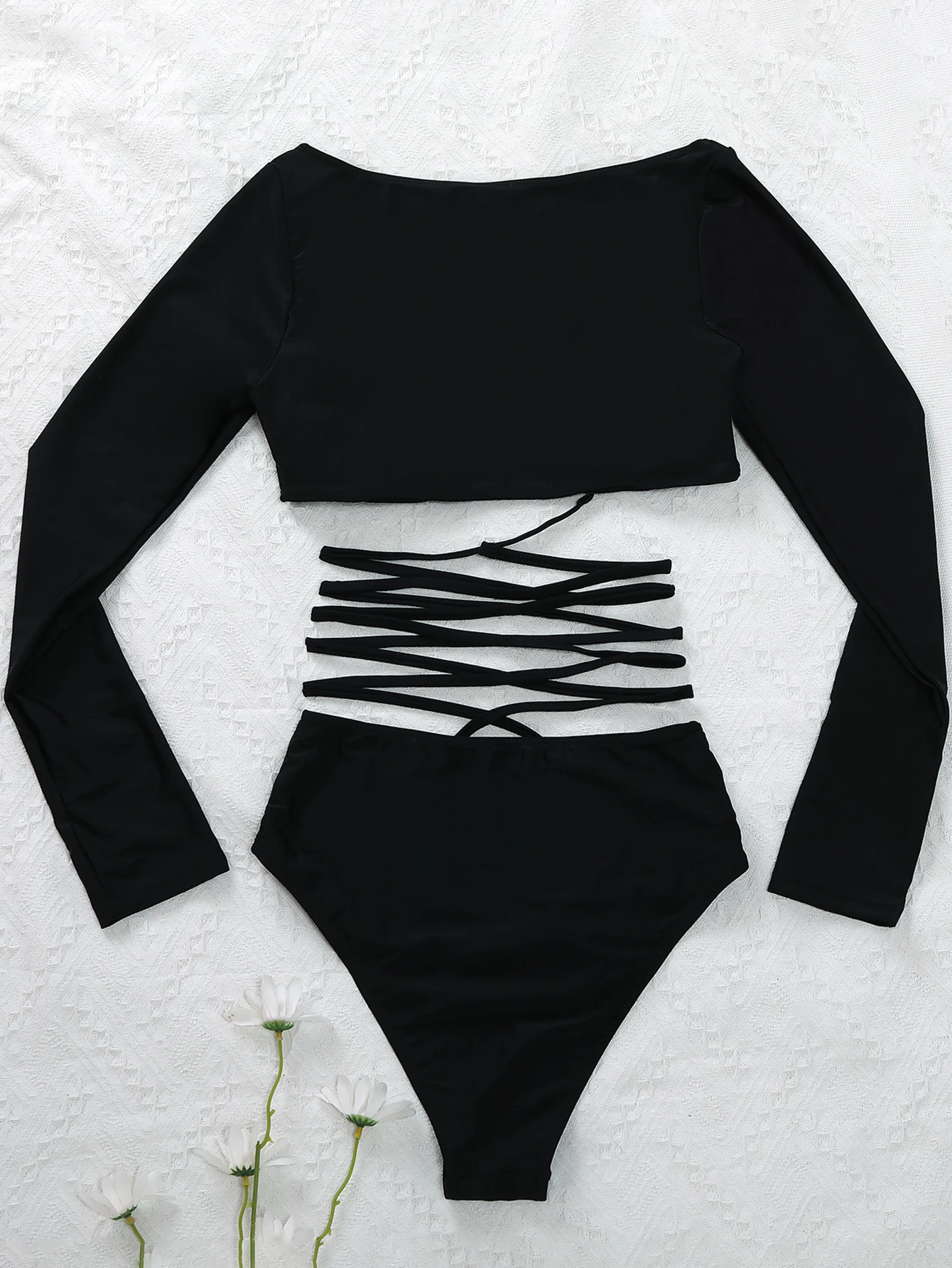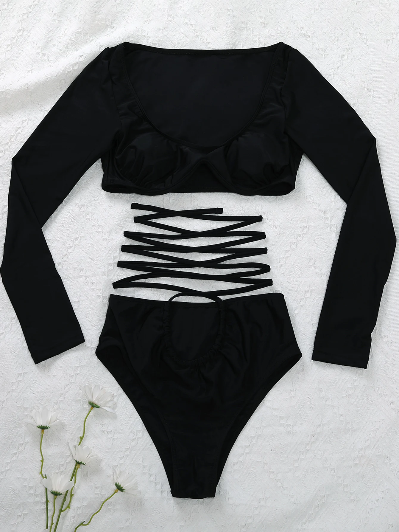 Соблазнительное бикини с длинным рукавом, женское однотонное черное Бандажное бикини с вырезами, купальник из двух частей, спортивный купальный костюм, купальник с высокой талией