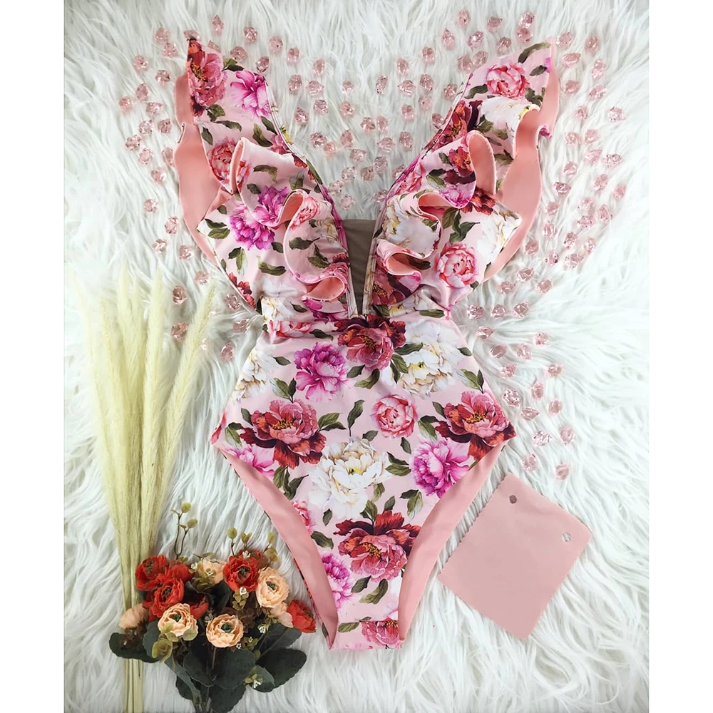 Женский слитный купальник, монокини с цветочным принтом, оборками и...
