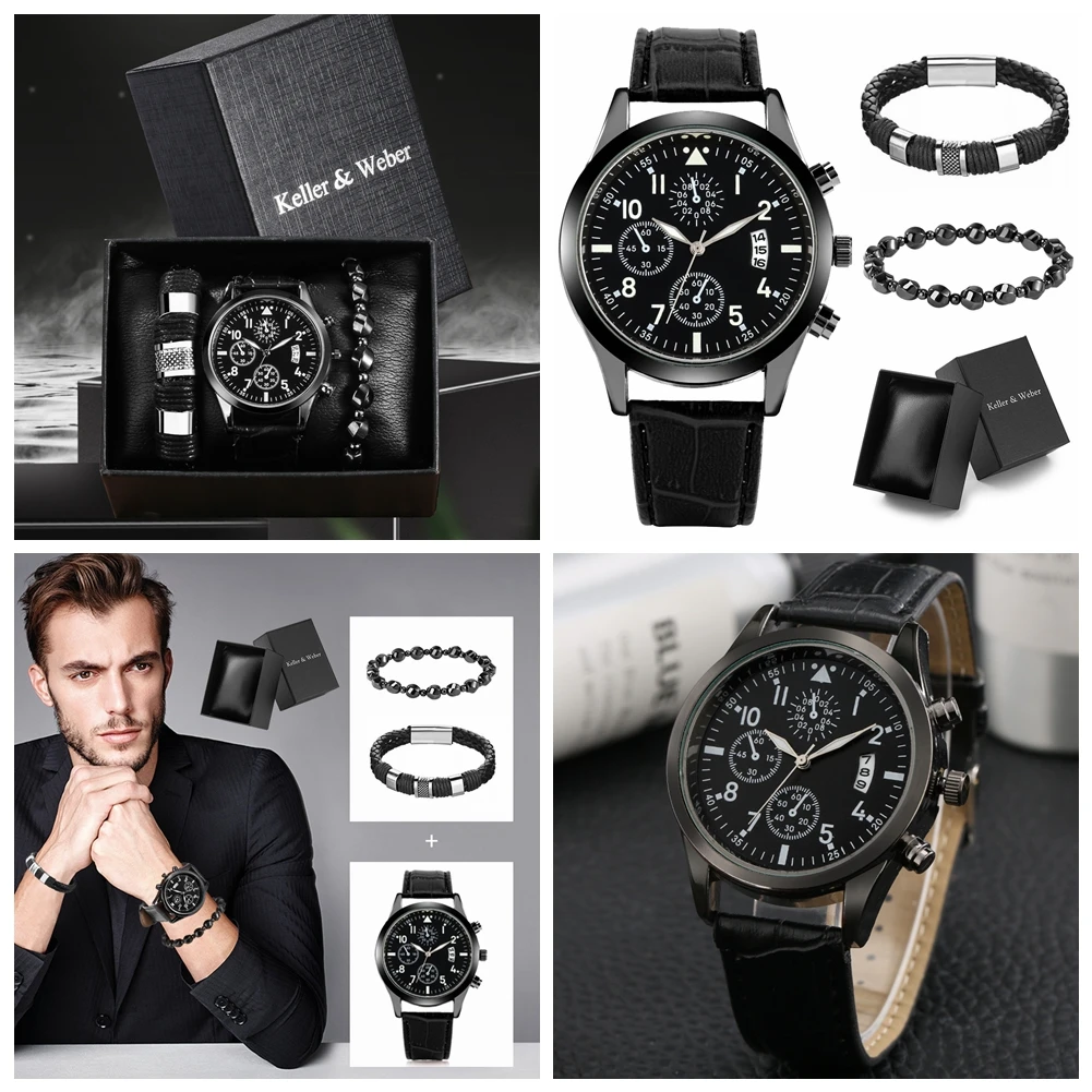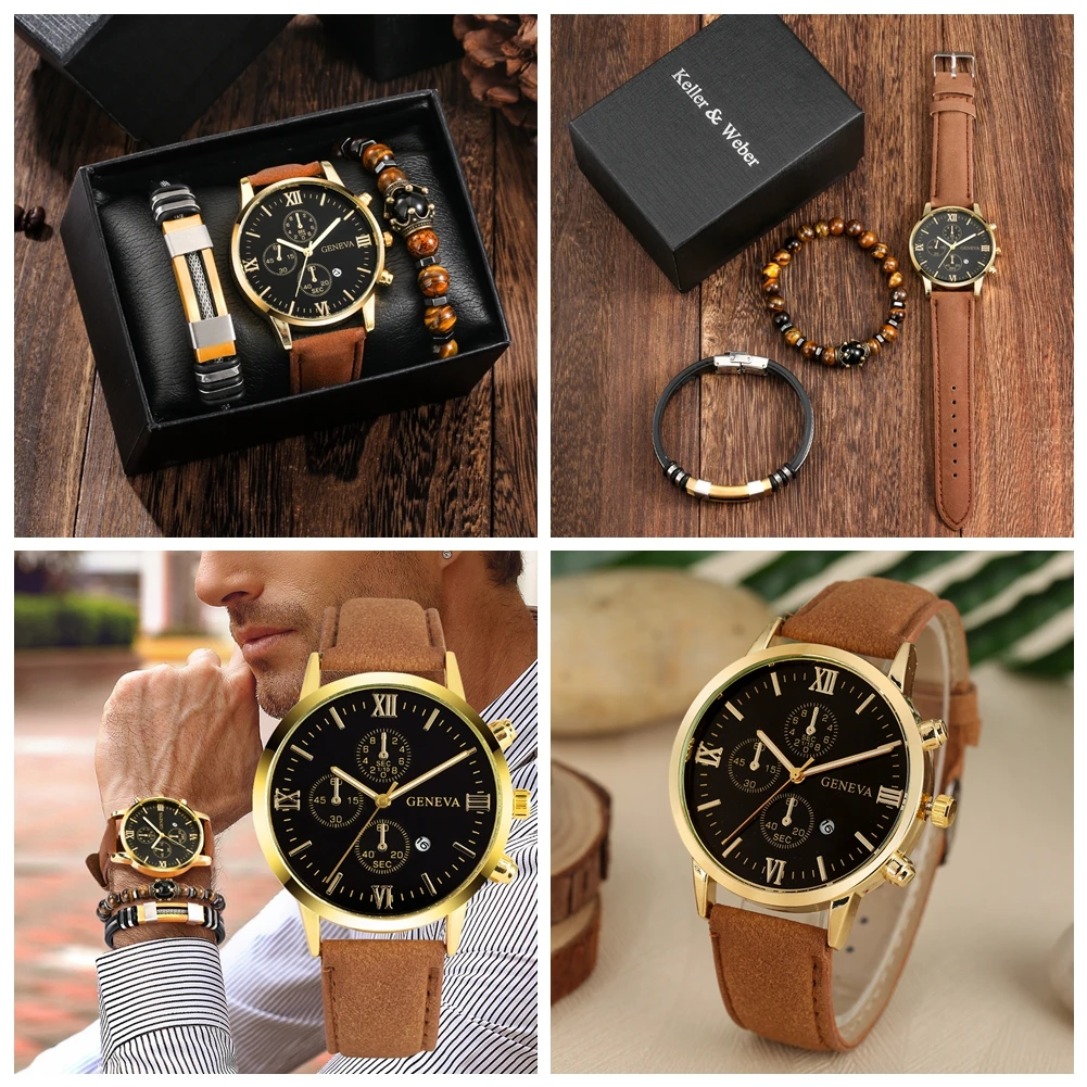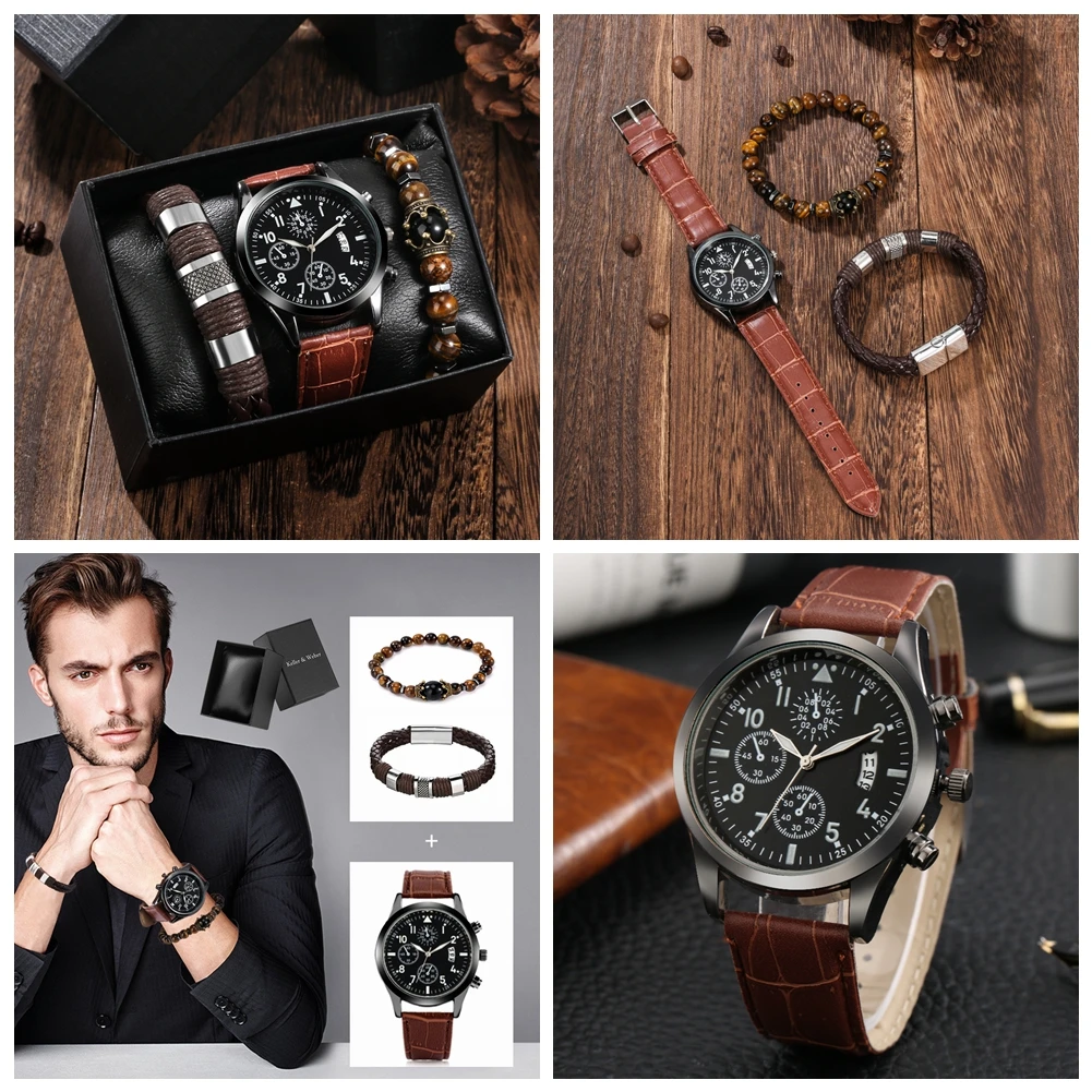 Набор Классических мужских часов и браслетов, кварцевые наручные часы с кожаным ремешком, регулируемый браслет, комплект в подарок на день рождения и Рождество для мужчин