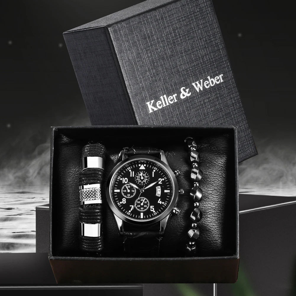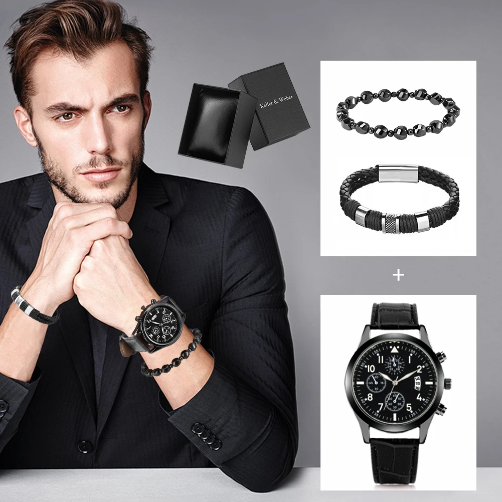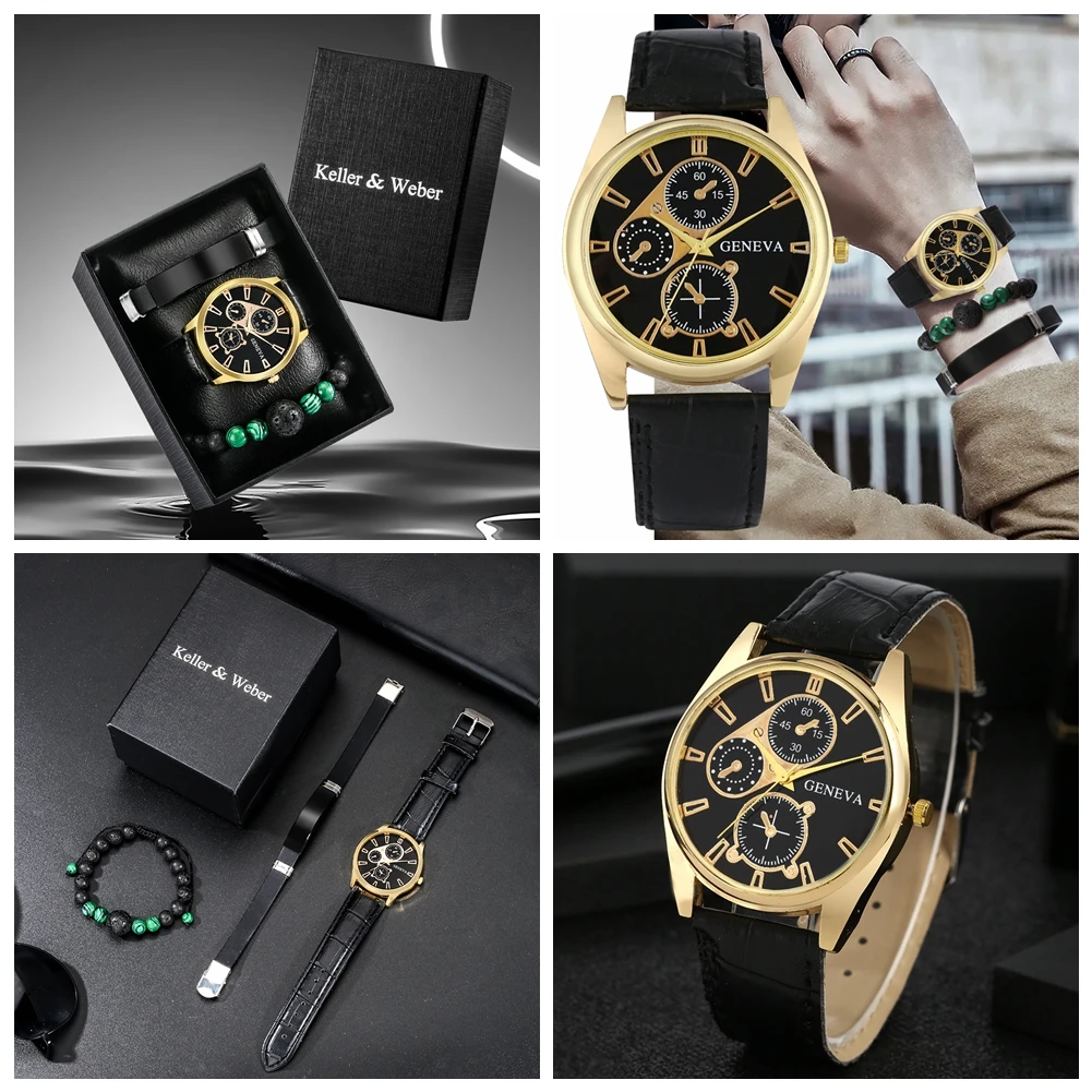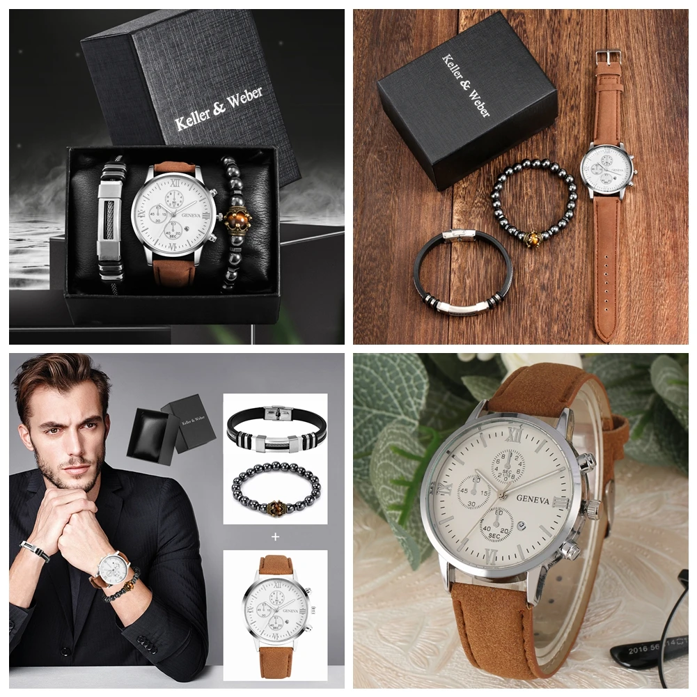 Набор Классических мужских часов и браслетов, кварцевые наручные часы с кожаным ремешком, регулируемый браслет, комплект в подарок на день рождения и Рождество для мужчин
