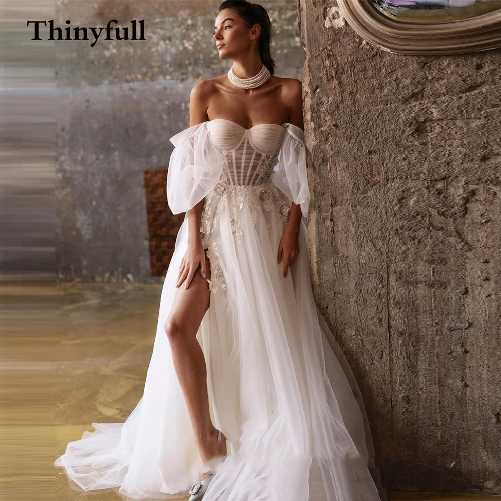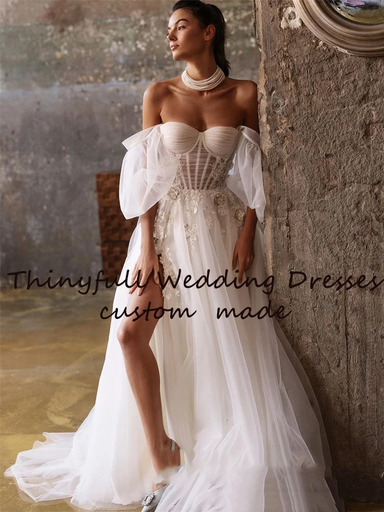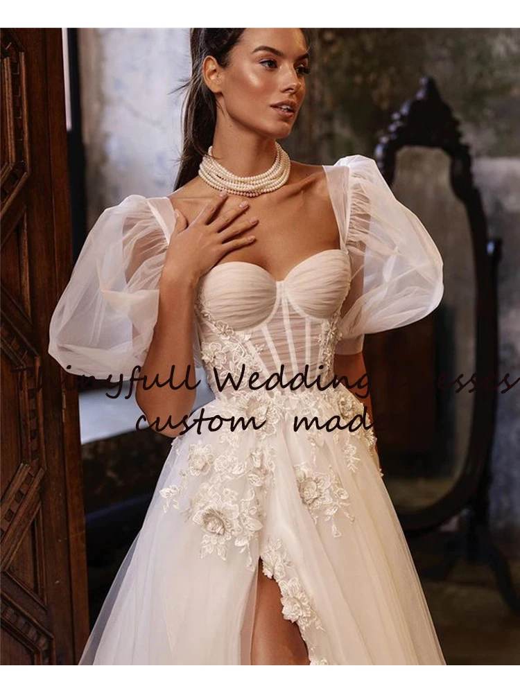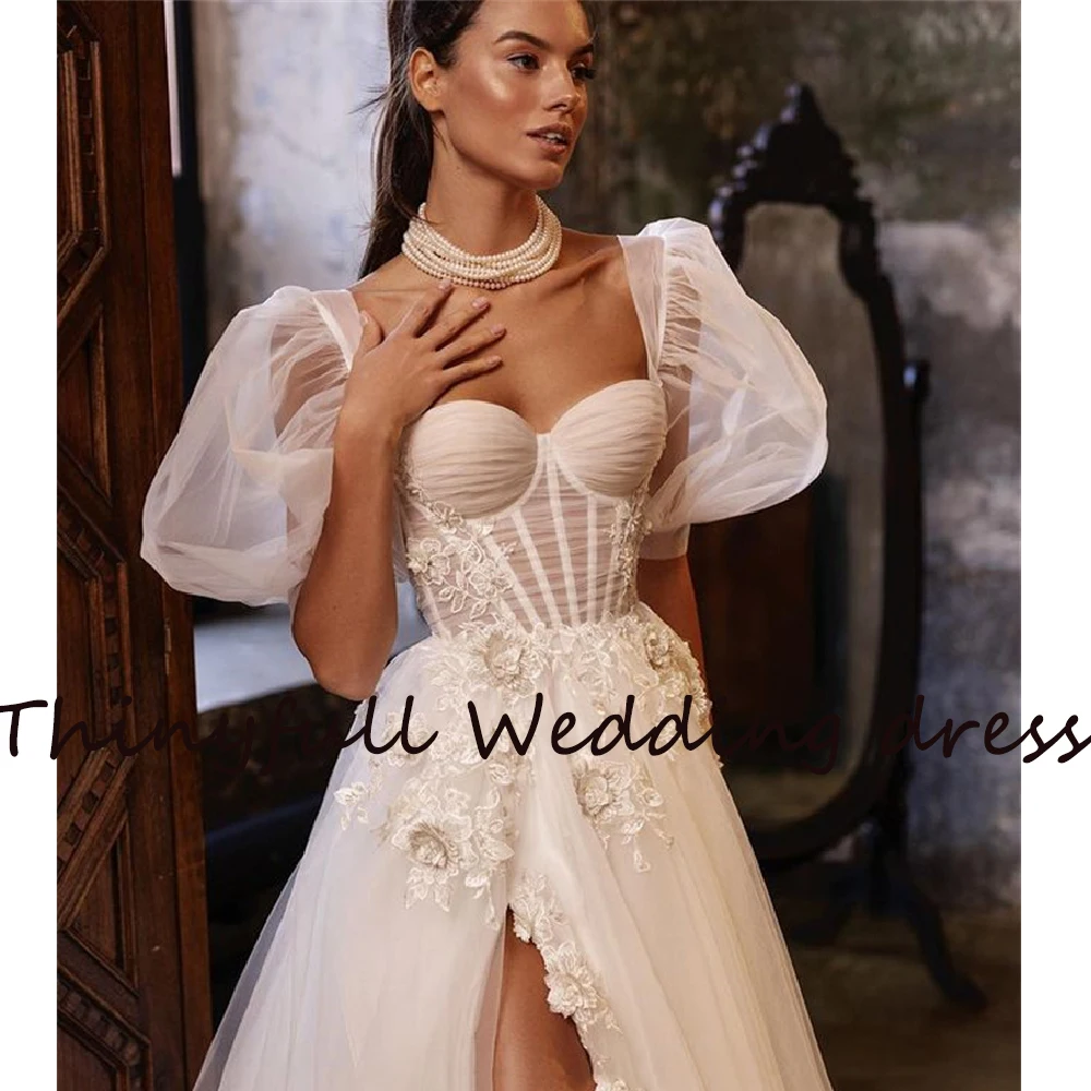 Современные Роскошные Длинные свадебные платья с 3D цветами, кружевом, сердечком, с коротким рукавом, разрезами по бокам, свадебные халаты в стиле бохо