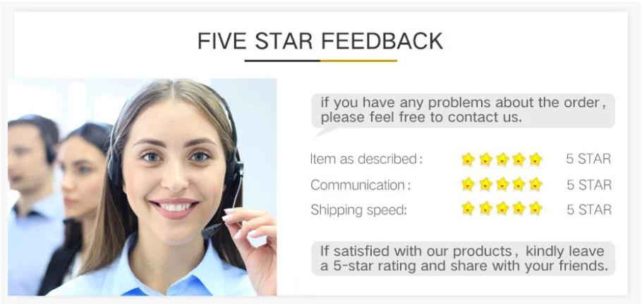 1. Ваше подтверждение будет высоко оценено после получения товаров. Как только вы получили товар, надеемся, что вы оставите нам положительный отзывы (4 или 5 звезд).2. Прежде чем оставлять негативные отзывы. Сначала свяжитесь с нами, и мы поможем вам решить проблему.3. Мы стремимся сделать все лучше, чтобы вы были довольны!