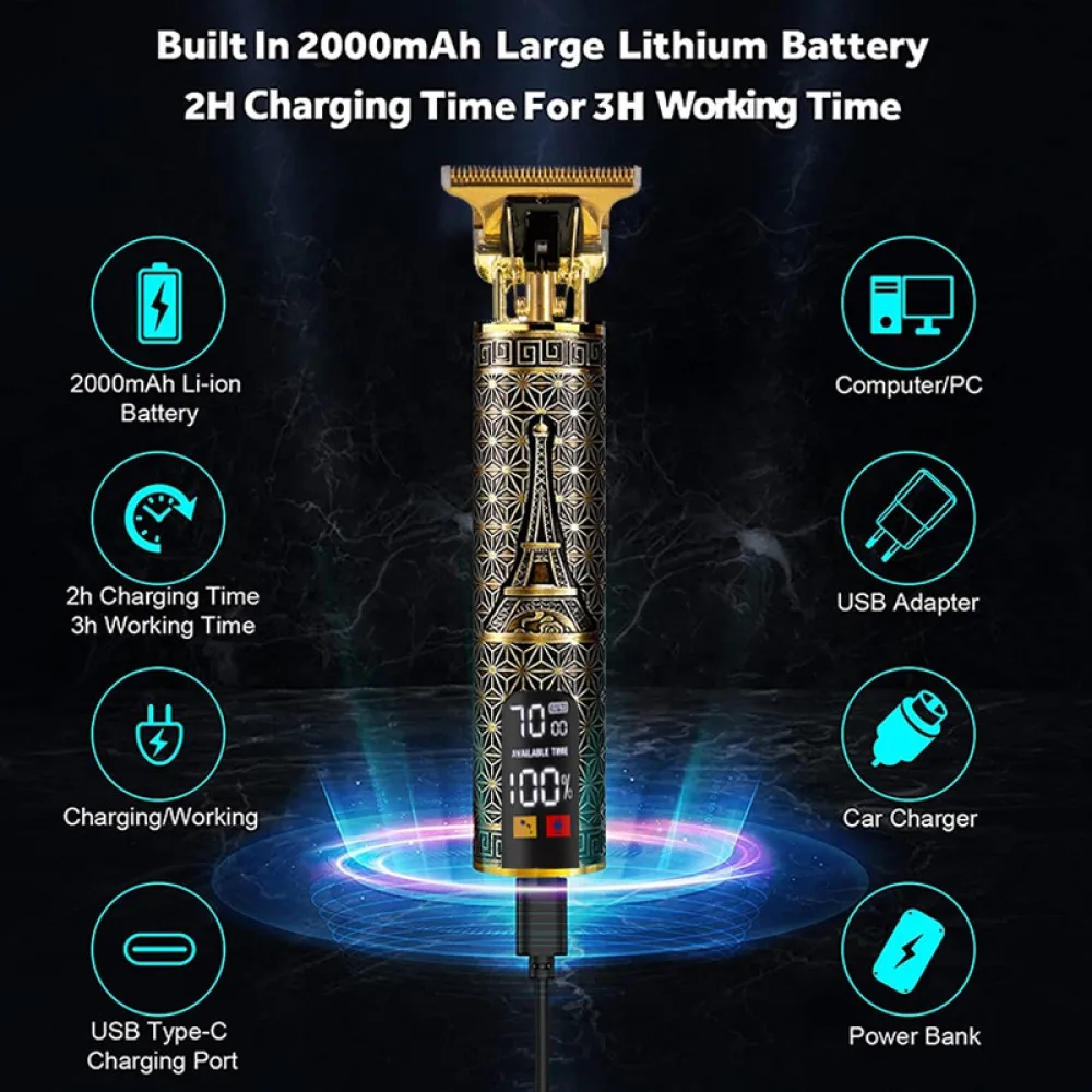 ОсобенностиМоющаяся круглая Ножевая головка, маленькие зубцы ножа.Перезаряжаемый: литий-ионный аккумулятор емкостью 1200-2000 мА · ч обеспечивает более 120 минут бесперебойного работы; Заряжает всего за 2 часа.Особенности технологии постоянной скорости; Не будет тащить или останавливаться через тяжелые и густые волосы.Включите светильник, не нажимайте кнопки и выключатели. Металлический нескользящий каркас для легкой линии ups и обшивки кромок.Оригинальная головка ножа T9 с гладкими металлическими лезвиями подходит для масляная голова, обрезки и скульптуры.Подходит для мужчин, женщин, пожилых людей, детей, парикмахерских.Советы1. Наш продукт поставляется с кабелем для зарядки2. Смазывающее масло является жидким, относится к товарам, авиакомпания и таможня не принимают транзит, пожалуйста, обратите внимание! Спасибо за понимание, хороший день