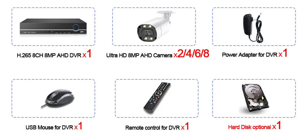 1 х 8-канальный H.265 AHD 4K DVR NVR HVR 6 в 1 цифровой видеорегистратор;2/4/6/8 X HD 8.0MP для дома и улицы ИК Full Цвет ночного видения камеры;1 х адаптер питания для DVR;1 X USB мышь для DVR;1 компакт-диск программного обеспечения для DVR;1 пульт дистанционного управления для DVR;Жесткий диск опционально!Видео кабель в комплект не входит!