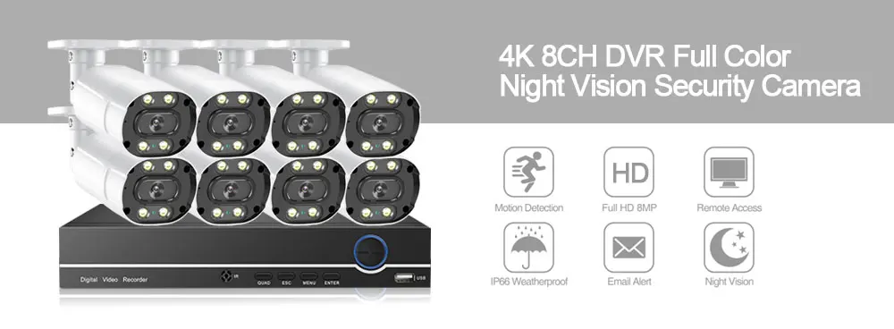 1.8MP Ультра HD видео, улучшенное H.265 видео сжатие;2.HD 8MP AHD камера и 6 в 1 гибридный цифровой видеорегистратор;3. Поддержка распознавания и воспроизведения лица;4. Все камеры поддерживают полноцветное ночное видение;5. Все камеры имеют сверхпрочный металлический корпус, IP66, защищенный от атмосферных воздействий;6. Ультра HD дневное и ночное видение, подключи и работай, легко настроить;7. Поддержка Android,iphone,ipad,pc,vACms view;8. Поддержка обнаружения движения, оповещения по электронной почте, воспроизведение видео, многоязычный;9. Удаленный просмотр в любом месте в любое время;