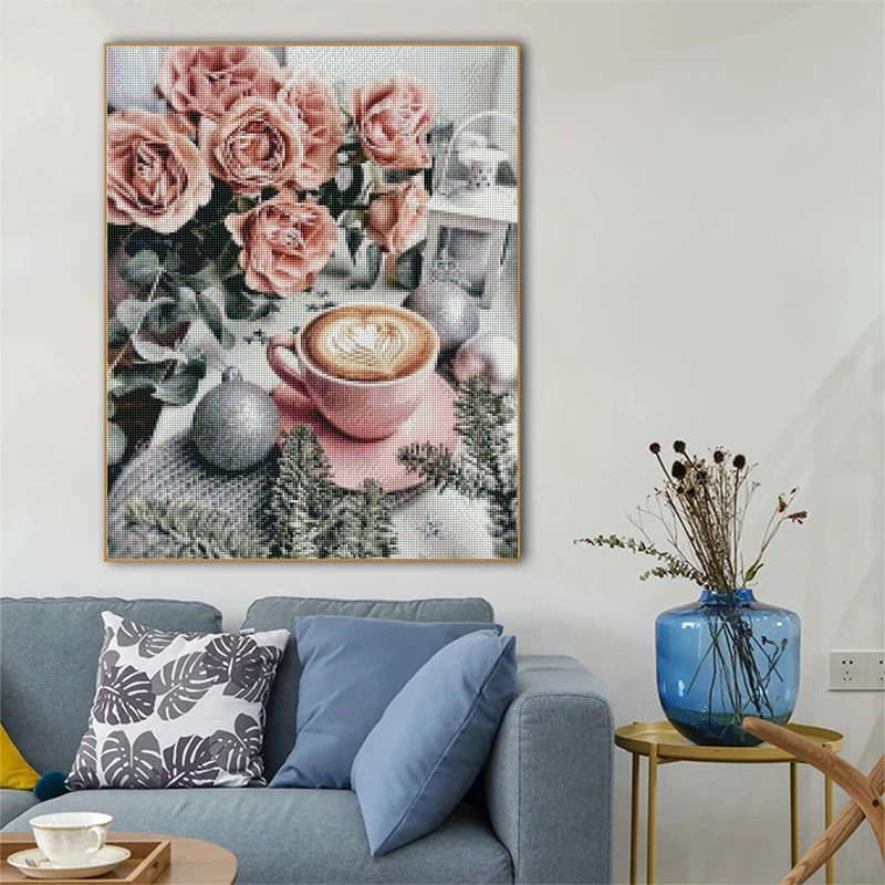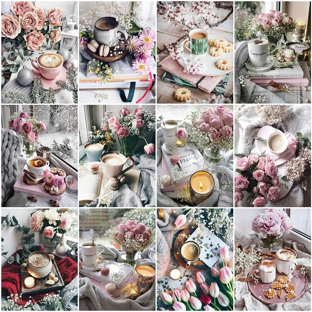Полноразмерная алмазная живопись с цветами 5D, сделай сам, круглая вышивка, Алмазная мозаика, пейзаж кофе, вышивка крестиком, Розовый декор для стен
