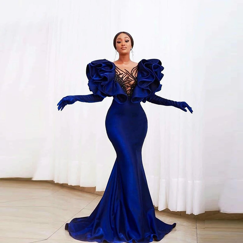 Темно-синие бархатные платья-русалки для выпускного вечера с прозрачным воротником и оборками Aso Ebi стильные африканские вечерние платья со шлейфом не входят в комплект