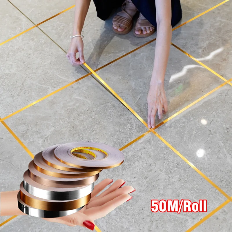 0,512*5000 см, серебристаяЗолотистая клейкая Полоса для напольной плитки, наклейка для швов, водонепроницаемая настенная уплотнительная лента, красивая сшиваемая медная пленка