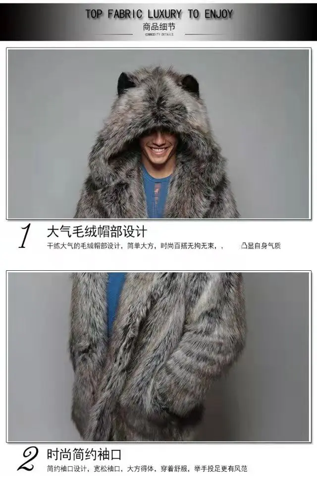 Зимнее Мужское пальто из искусственного меха с капюшоном в ушах, теплый плюшевый Кардиган с длинным рукавом в виде медведя, толстая Тедди куртка, Мужская длинная парка, размеры 5xl