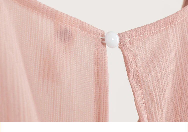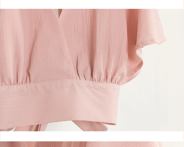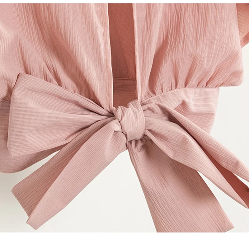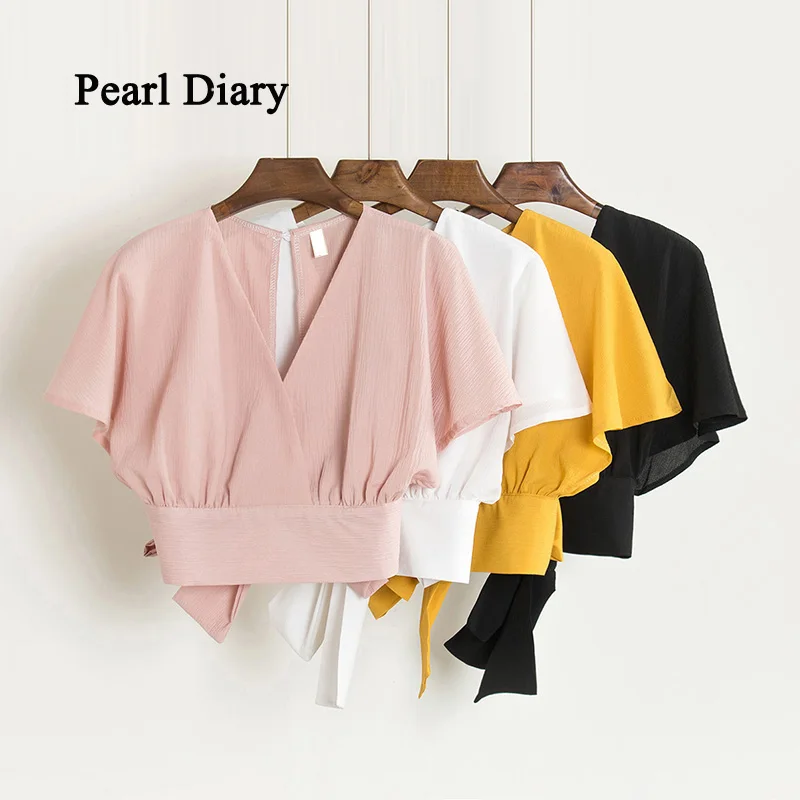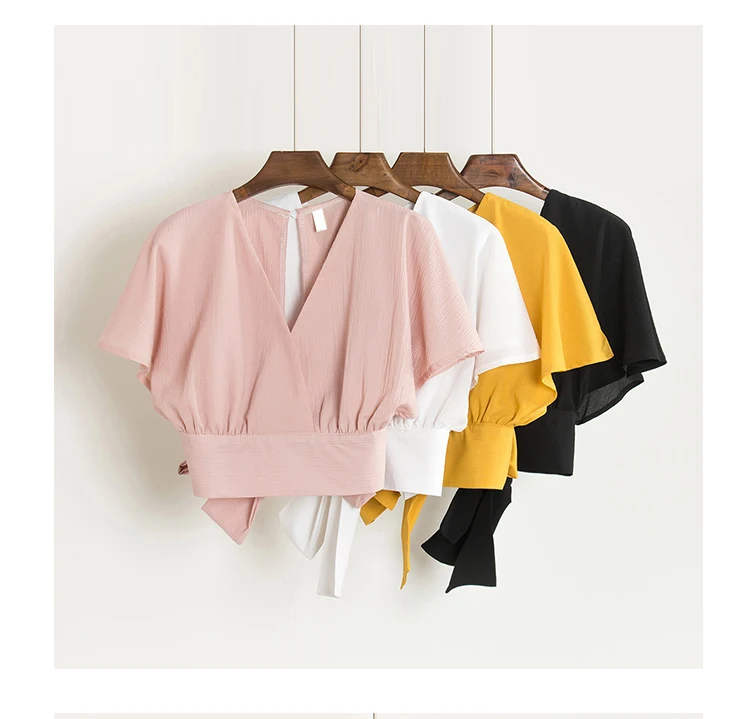 Футболка женская шифоновая с бантом на спине, пикантная короткая рубашка с V-образным вырезом, с открытой спиной, с жемчужным дневником, лето