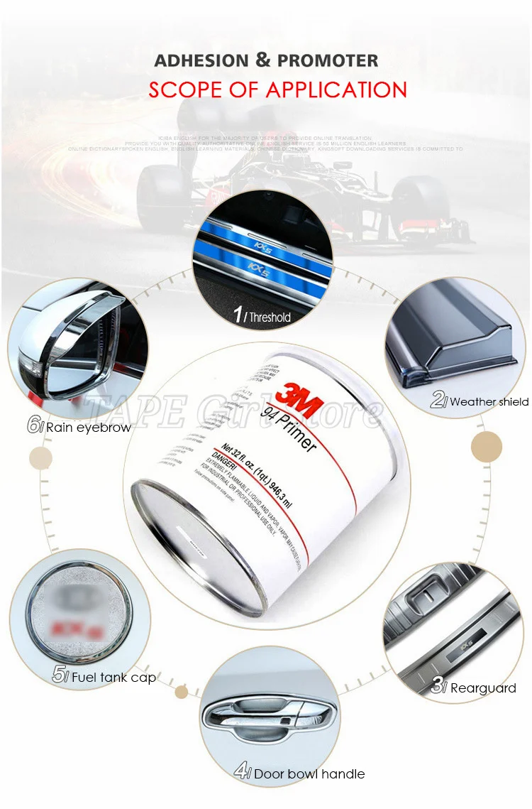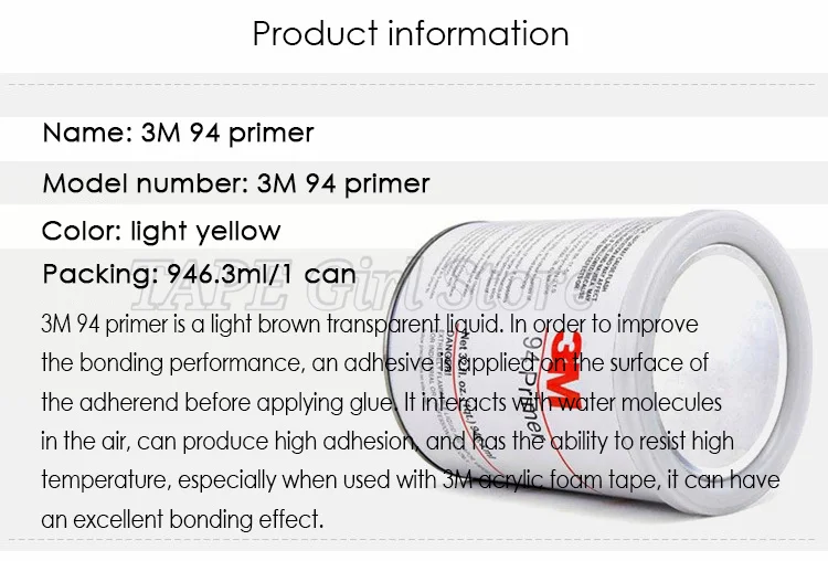 3. 3m 94 праймер адгезии промоутер не может быть использован отдельно. Он не липкий, когда используется отдельно. Его необходимо использовать вместе с двусторонней лентой. Адгезионные Промоутеры являются вспомогательными.