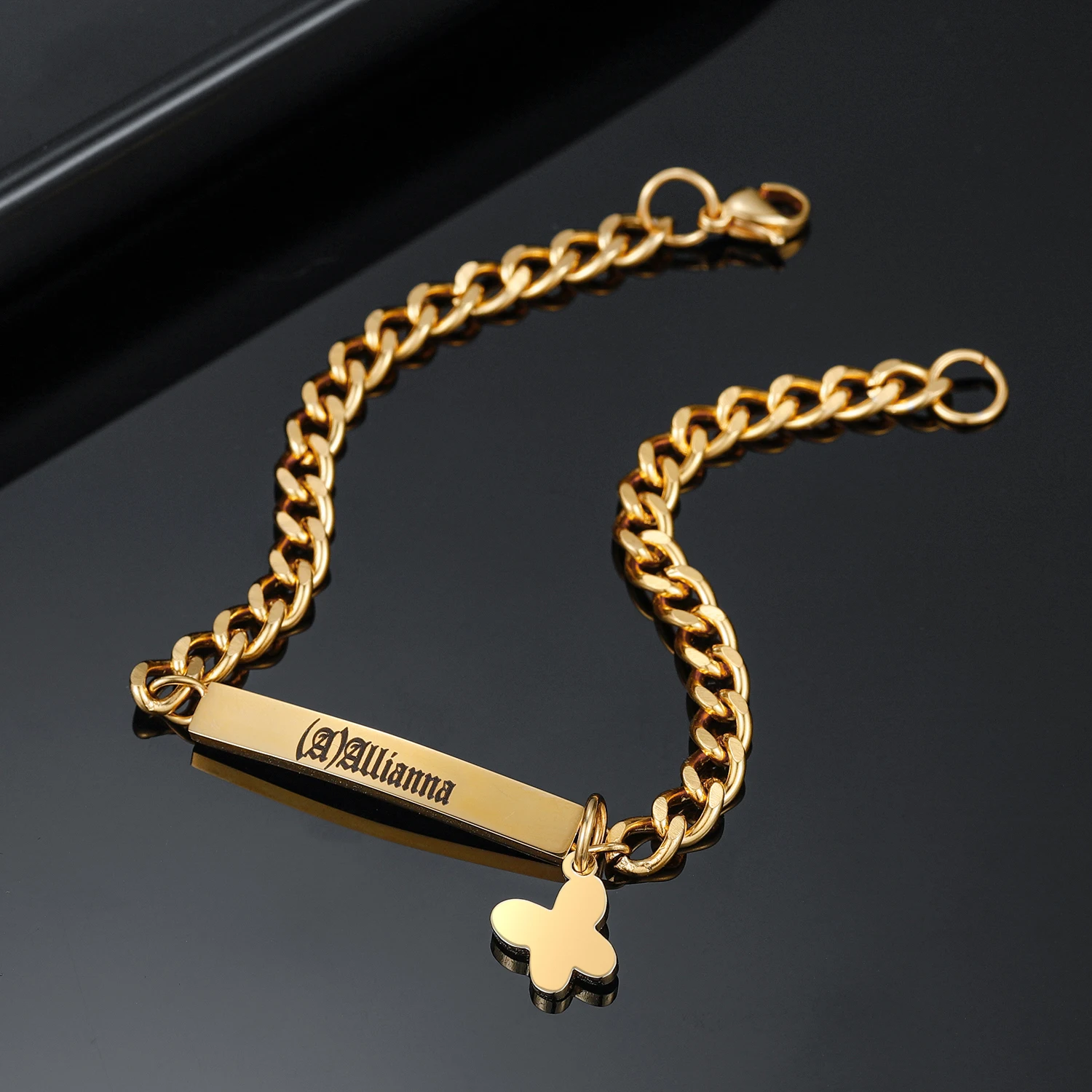 Браслет с надписью персонализированное выгравированное название для детей, золотистый браслет-бабочка из нержавеющей стали для девочек, Женские Ювелирные изделия, подарки