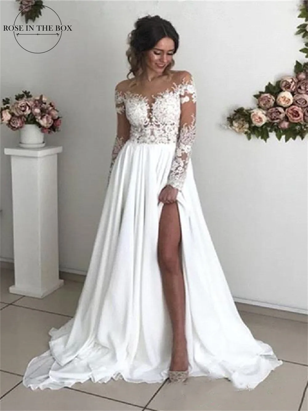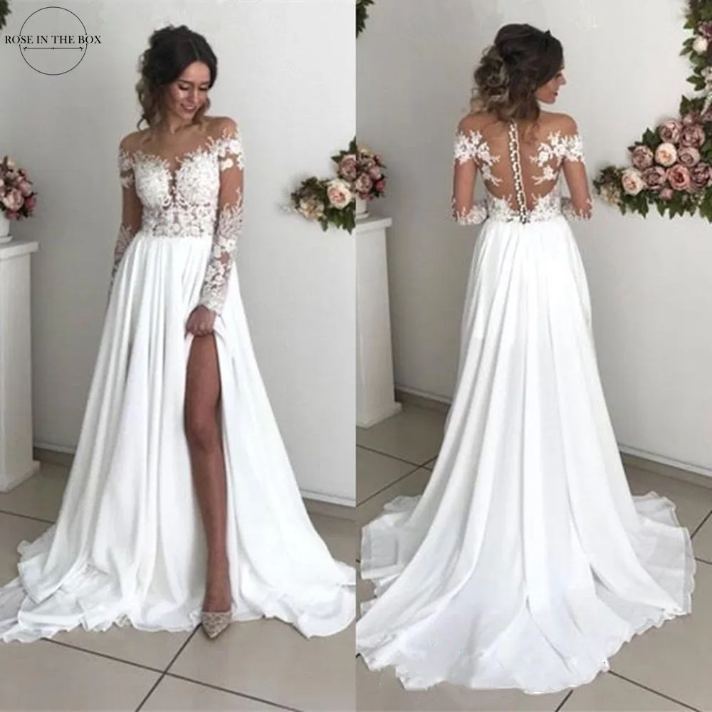 Романтическое кружевное свадебное платье А-силуэта в стиле бохо 2022, соблазнительные Свадебные платья с высоким разрезом на спине и длинным рукавом, свадебное платье