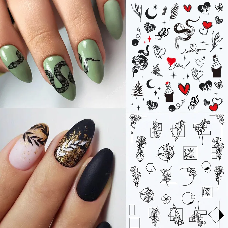 Наклейки для ногтей с черными листьями, цветами и мраморным узором