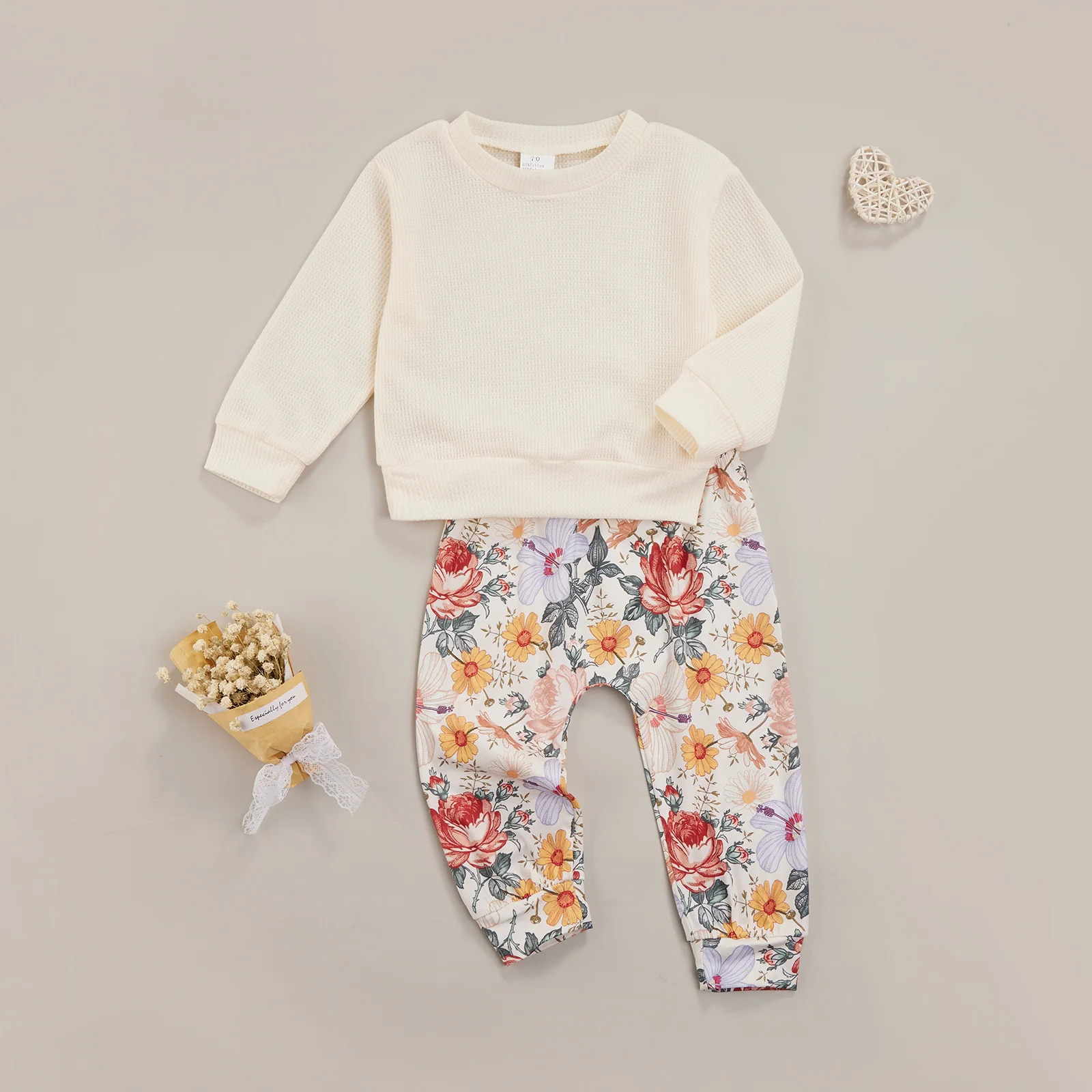 Модная Однотонная футболка с вафельным принтом и брюки с цветочным рисунком для маленьких девочек; Комплект из превосходного костюма позволит вашим детям освежиться и чувствовать себя комфортно, полон энергии и энергии. Эти повседневные топы с длинными рукавами и длинные штаны идеально подходят для девочек на каждый день или день рождения.