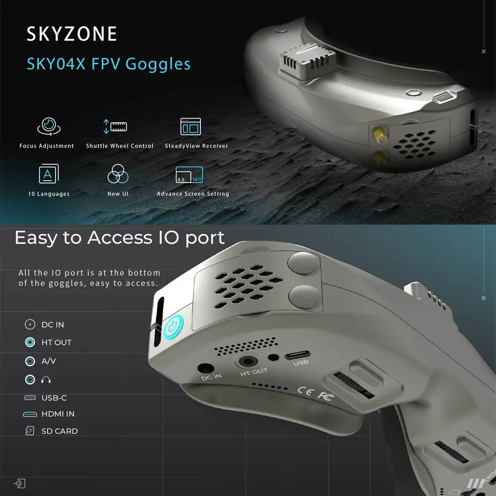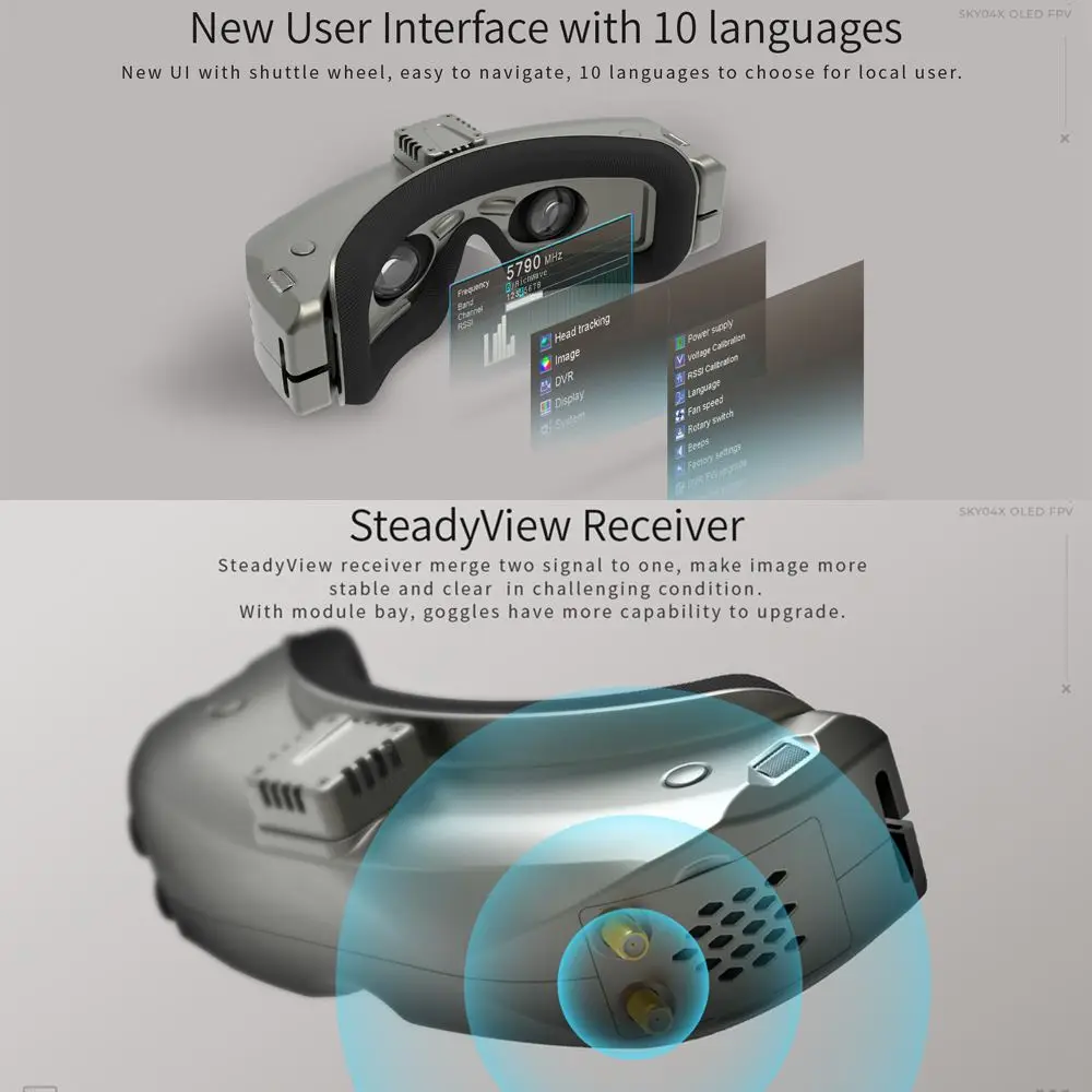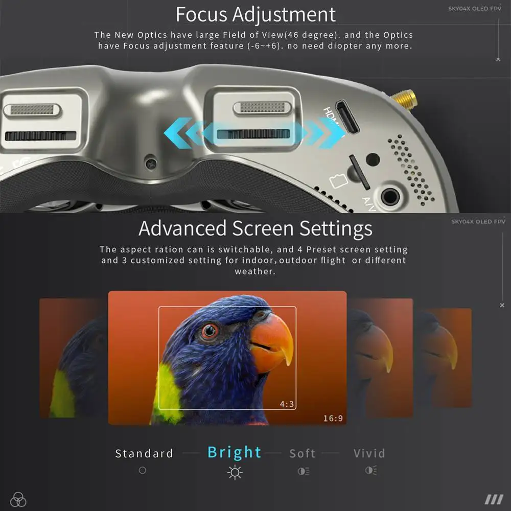 SKY04X V2 является первым goggle skyzone с регулировкой фокуса, экран с высоким разрешением 1280*960 имеет яркий цвет и высокую контрастность, пилот может видеть более подробную информацию в гонках.