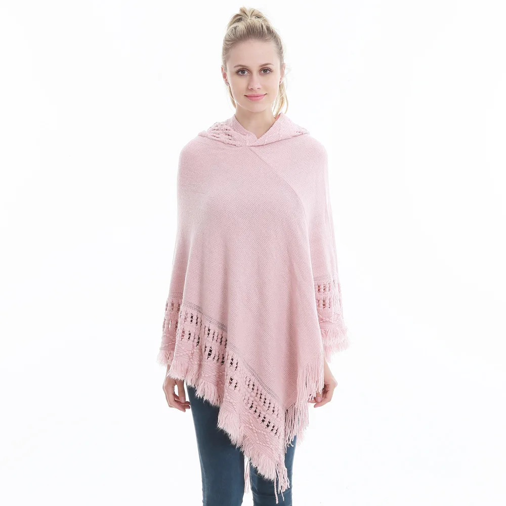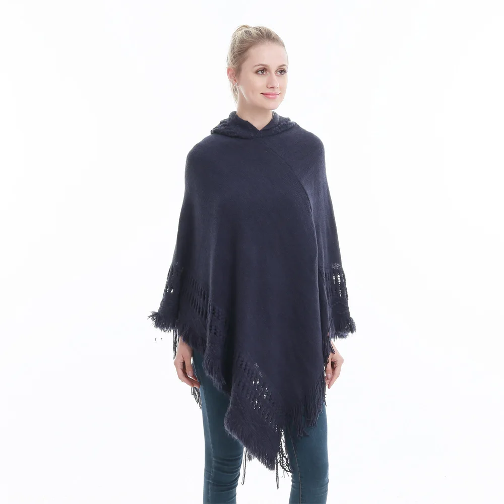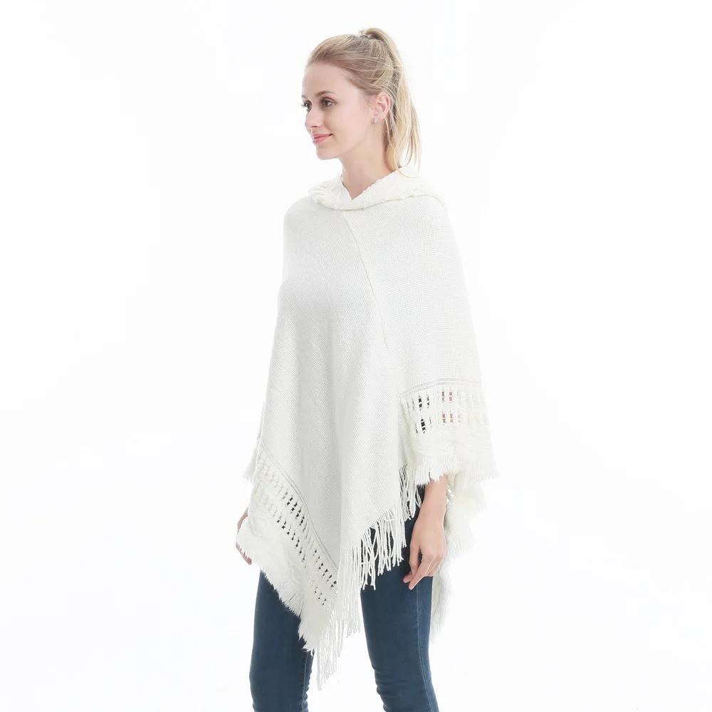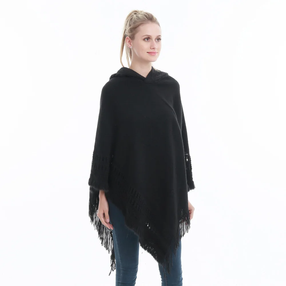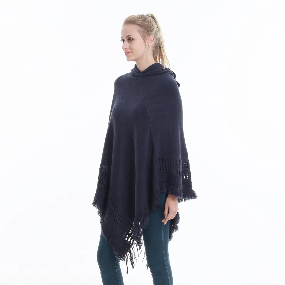 Зимний вязаный пуловер с капюшоном, женское пончо, однотонная Вязаная толстовка с капюшоном, свитер, шарф свободного кроя, шали с кисточкой для мужчин