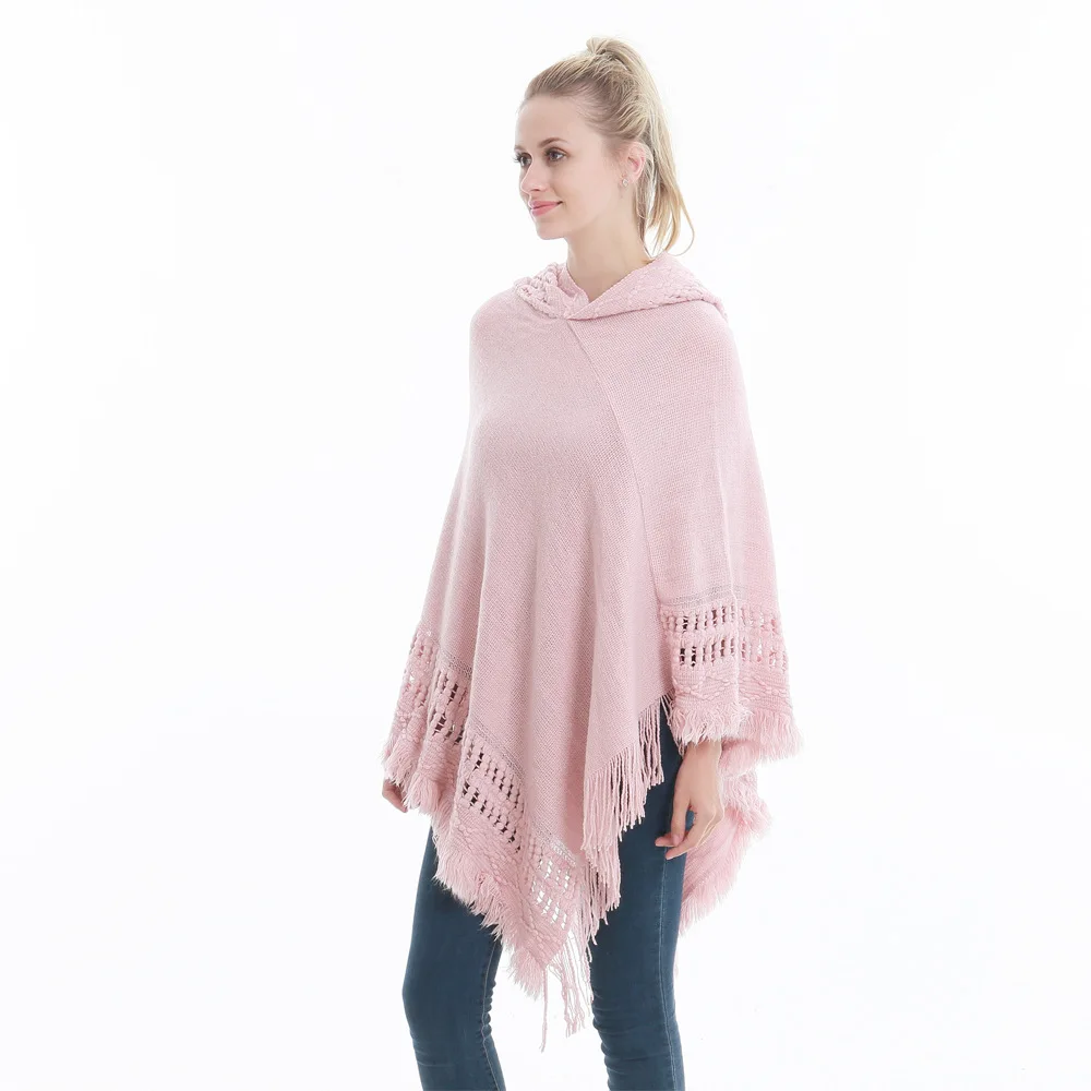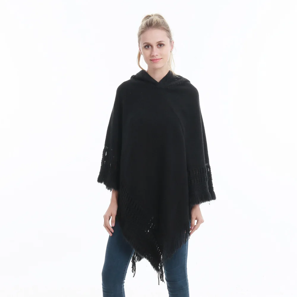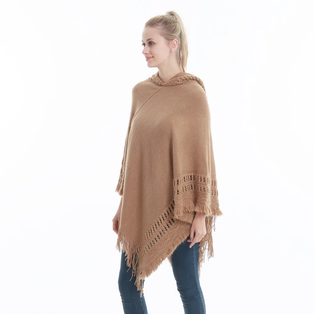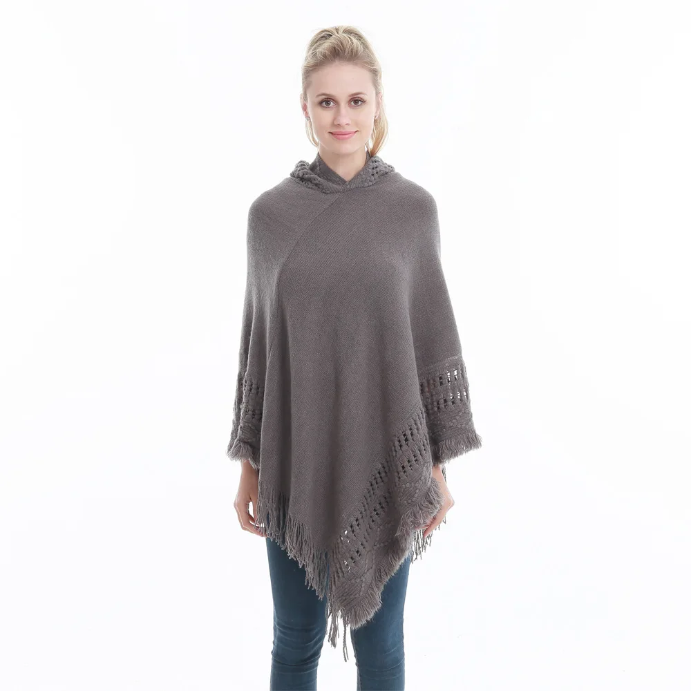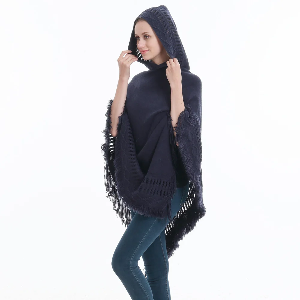 Зимний вязаный пуловер с капюшоном, женское пончо, однотонная Вязаная толстовка с капюшоном, свитер, шарф свободного кроя, шали с кисточкой для мужчин