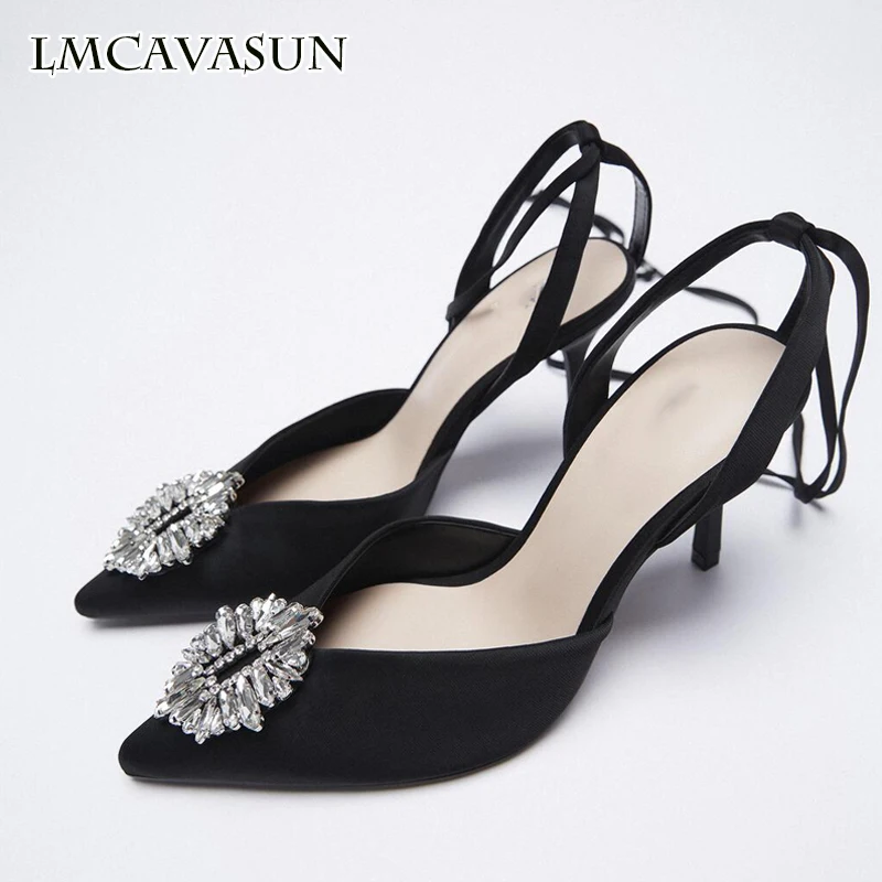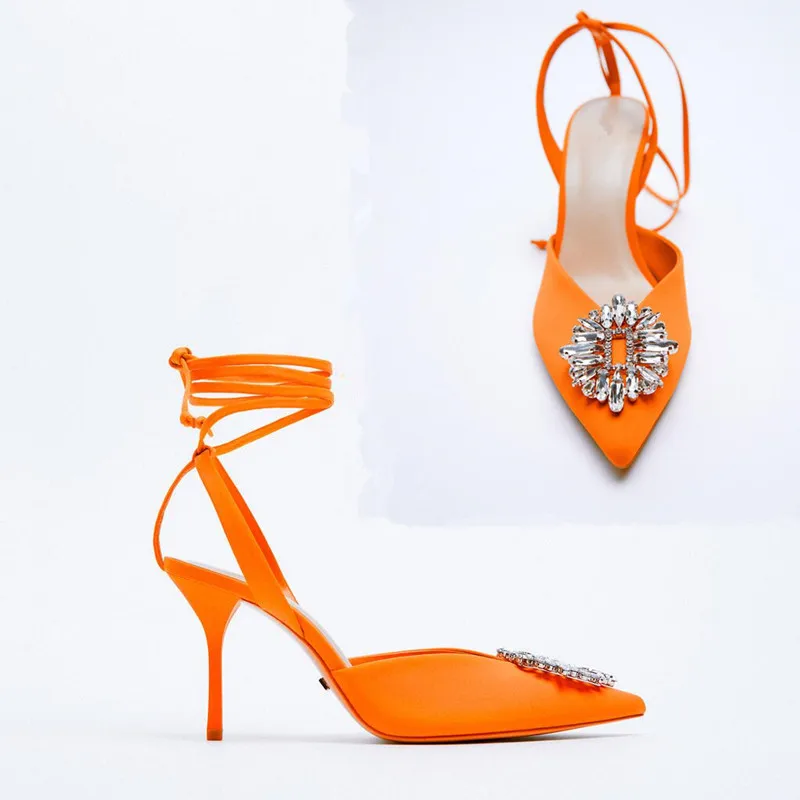 LMCAVASUN Za Осенняя Женская обувь оранжевые Яркие босоножки на ремешках с ремешками на высоком каблуке туфли без задника с острым носком женские сексуальные туфли-лодочки