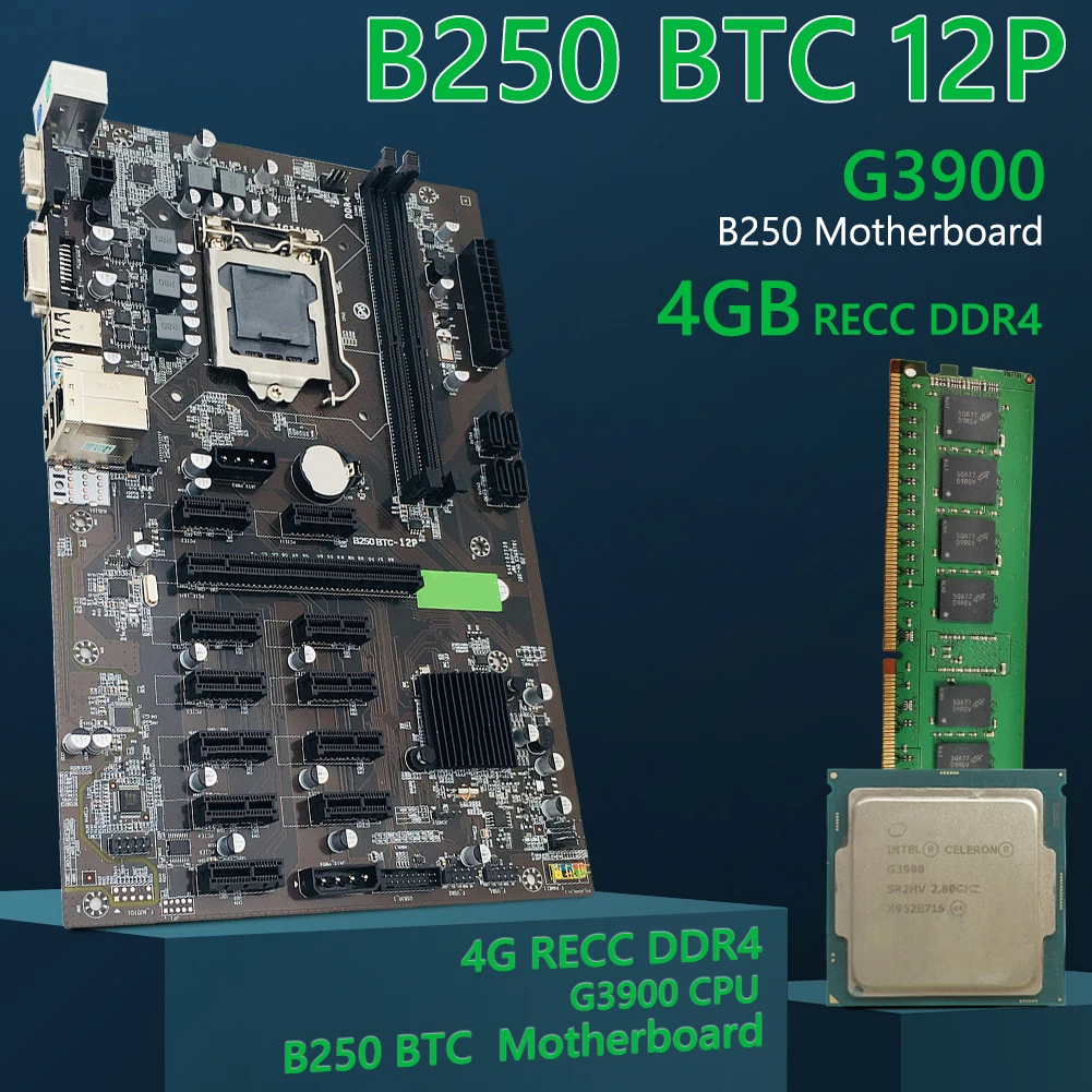 Комплект материнской платы B250 BTC 12P для LGA 1151 с процессором G3900, 12x PCI Express DDR4 2133, 4G память, доска для майнинга