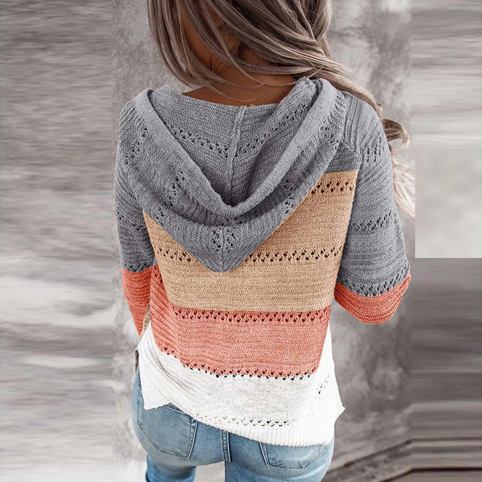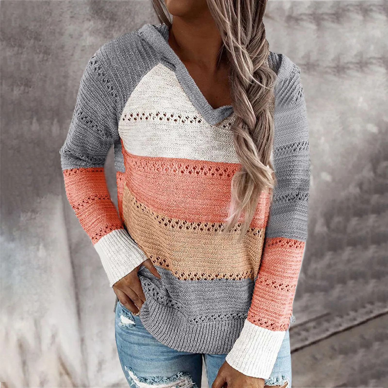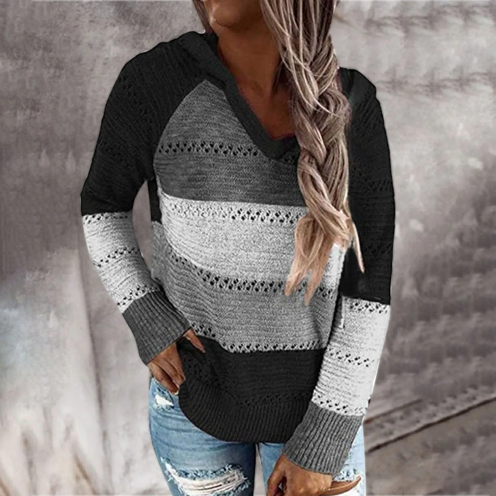 Женский вязаный свитер с капюшоном, повседневный Полосатый пуловер ...