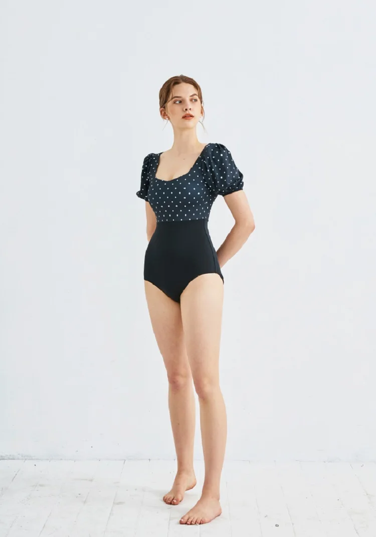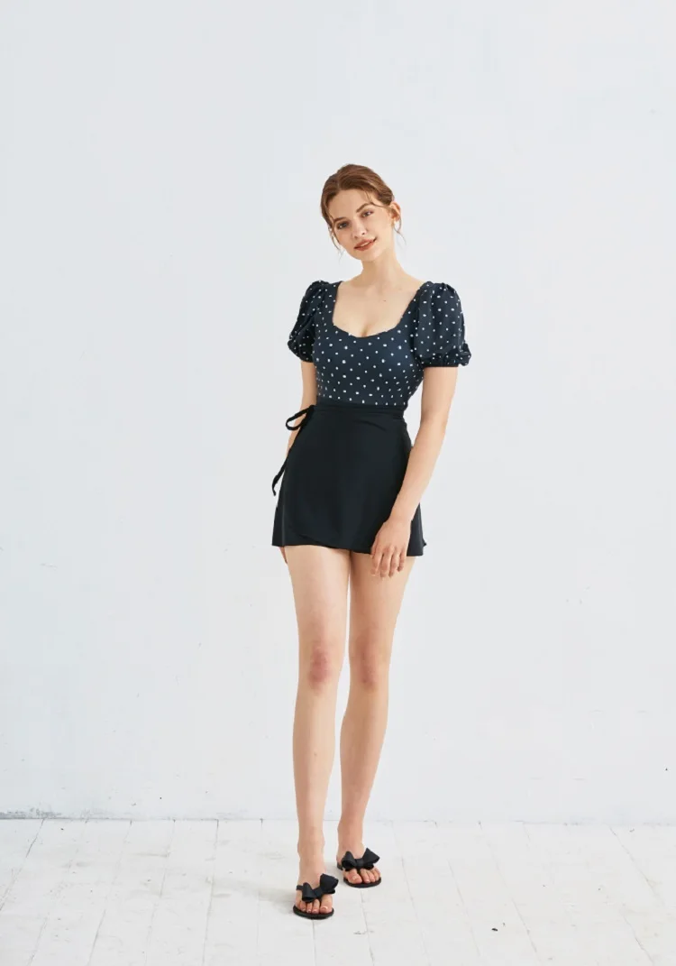 Слитный купальный костюм с пышными рукавами, женская одежда для плавания в горошек, женский купальный костюм с короткими рукавами, трикини, купальный костюм с подкладкой и юбкой
