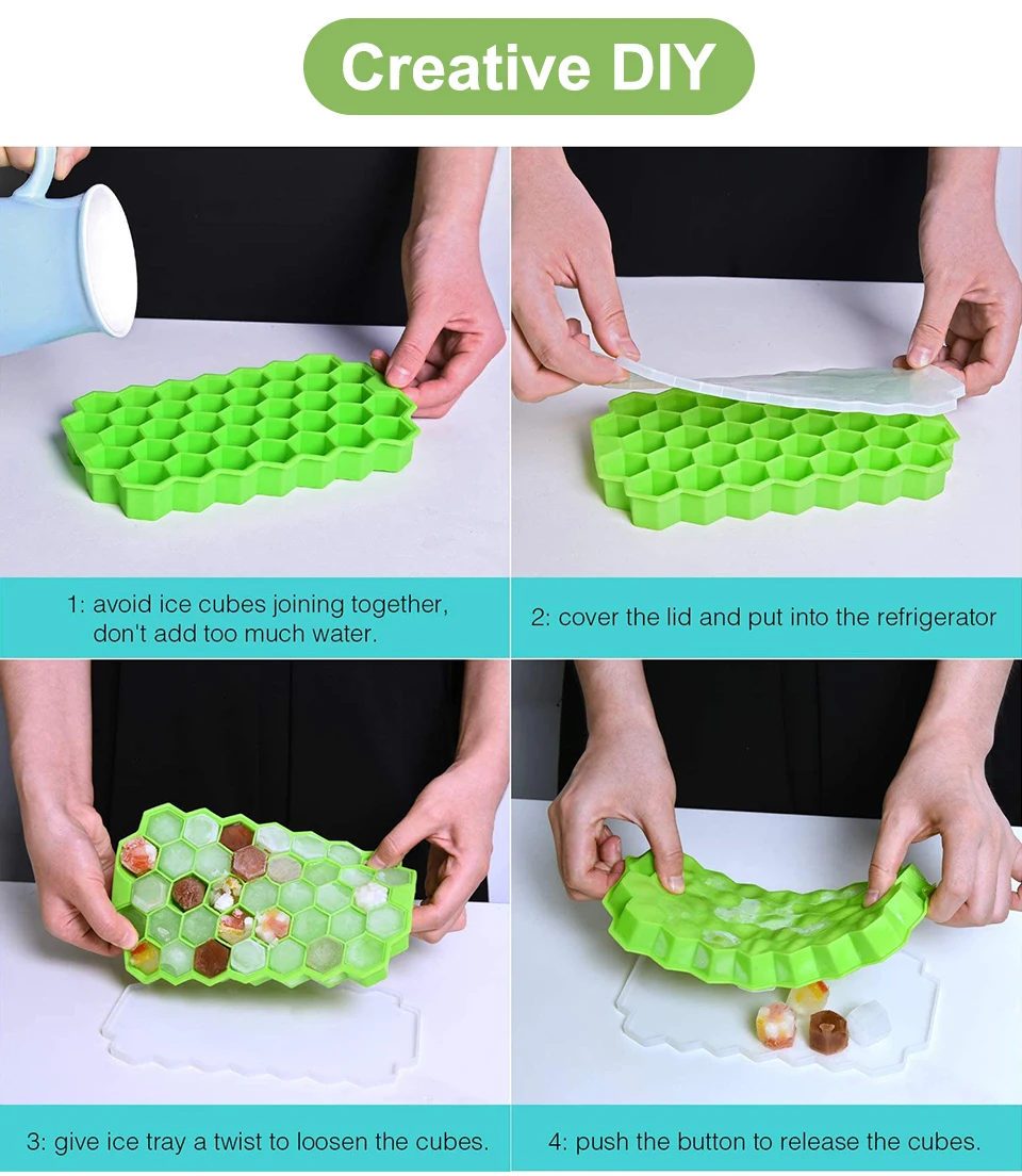 Сотовые формы, делая интересные кубики льда, делают ваше лето более интересным.BPA безопасный лоток для кубиков льда: силиконовый лоток для кубиков льда с крышками из пищевого силикона, детский пищевой силикон, 100% BPA бесплатно высококачественные материалы, силиконовый лоток для кубиков льда, который может использоваться для взрослых и детей. 100% подтвердите, что наши морозильные камеры силиконовые формы для кубиков льда и бренды приносят клиентам лучший опыт в производстве виски, кофе со льдом, поэтому вы можете быть уверены в покупке, не беспокоясь.Легкий лед: Наши покрытые лотки для льда изготовлены из мягкого силикона. Силиконовые ледяные подносы рекомендуется оставить холодильник на некоторое время легче, чтобы освободить лед, и мягкий силиконовый материал не сломается после замораживания в течение длительного времени. Лоток для льда, Складывающийся компактный размер, подходит для любого домашнего холодильника, общего мини-холодильника.Штабелируемая и съемная крышка: Наши штабелируемые силиконовые подносы для кубиков льда с крышкой, которая предотвращает лед от поглощения другого пищевого воздуха в холодильнике. И резиновые лотки для кубиков льда легко и аккуратно укладываются в холодильник, чтобы сэкономить место и не застревать. Чистый и аккуратный!Легко чистить: Наша силиконовая форма для льда имеет гладкую силиконовую поверхность для легкой очистки. Лоток для приготовления льда Рекомендуется мыть и тщательно сушить перед первым использованием. Наш лоток для льда с крышкой также можно мыть в посудомоечной машине. Удобство!Гарантия качества: штабелируемые лотки для льда, Милый силикон, применимый к-40 ℉ ~ 230 ℉, безопасные лотки для кубиков льда, безопасны в холодильнике, микроволновой печи. 100% удовлетворение!