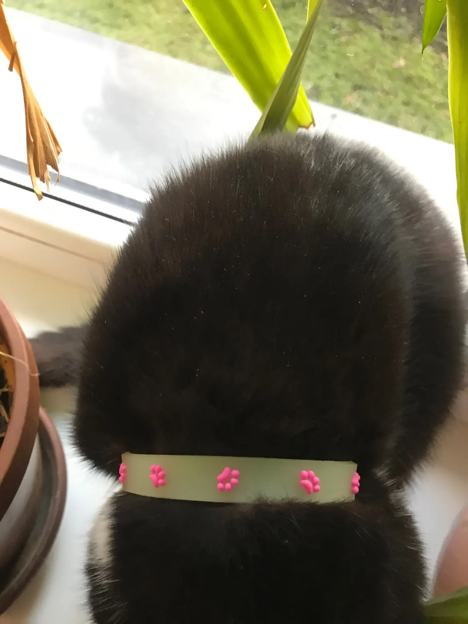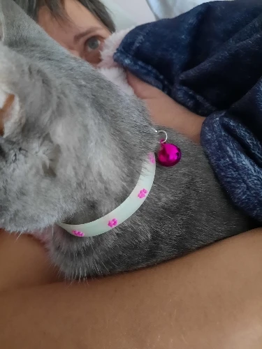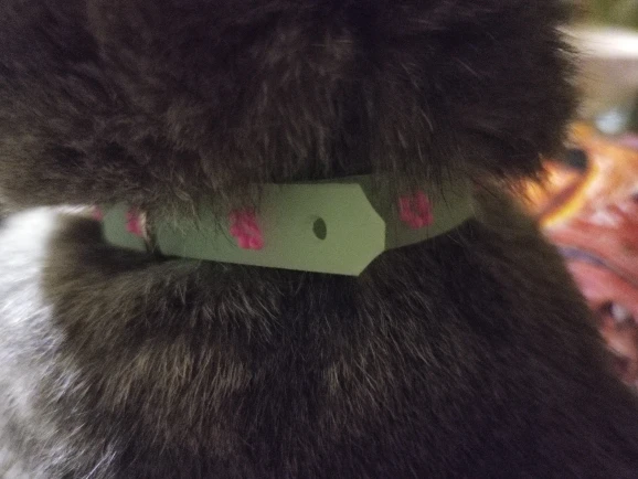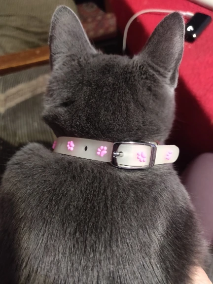 Прикольный ошейник, мне нравится, а кошке нет. Зато теперь, чёрную кошку легко найти в тёмной комнате. Спасибо за интересный товар.