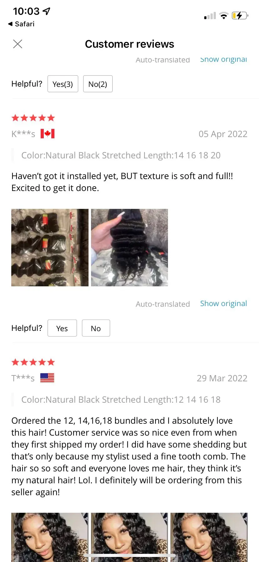 Первый раз заказываю волосы от Ali express и я впечатлен! Оставайтесь на связи во время доставки. Волосы соответствуют длине, они не запутываются, текстура очень мягкая! Волосы также не имеют запаха. Хорошие полные пачки, и я обязательно закажу снова! Я влюблен и доставка займет 3-4 дня :) удовлетворенный клиент!