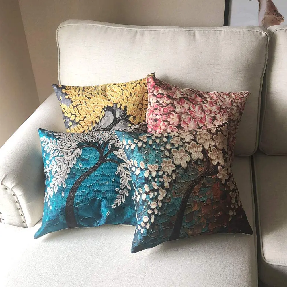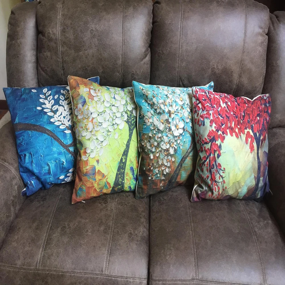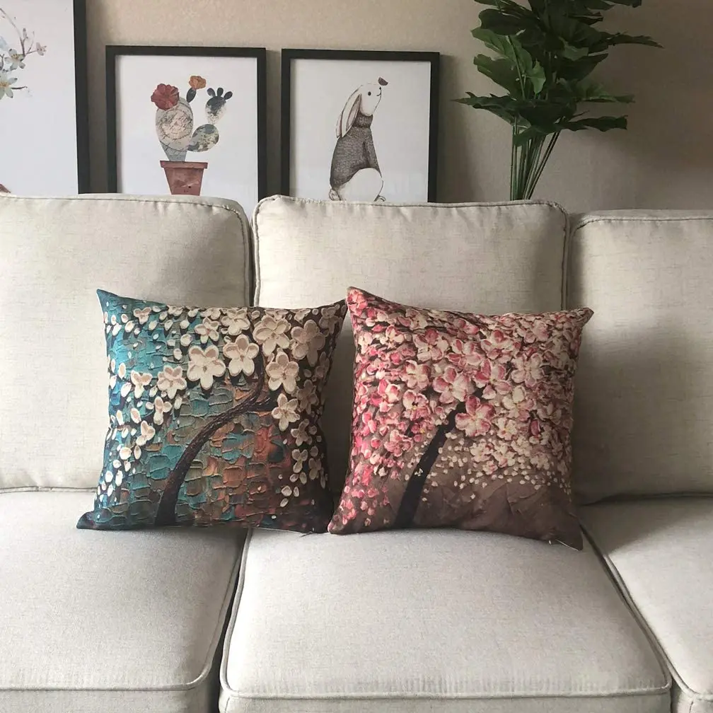 45 см льняная масляная живопись, черное большое дерево и цветы, птицы, диван, подушка с принтом, чехол, гостиная, диван, Декоративные диванные подушки