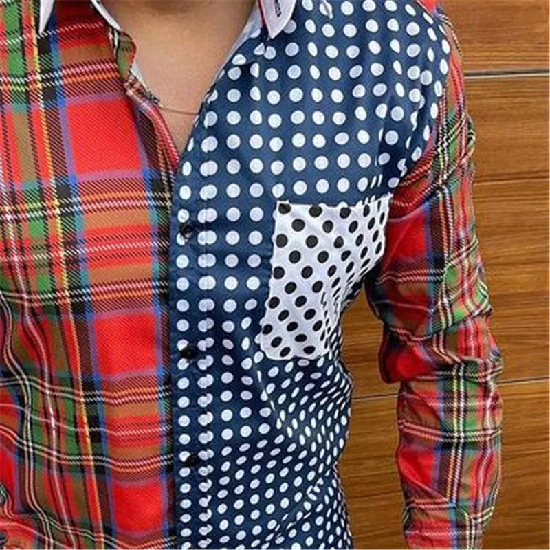 Модная рубашка с принтом в горошек, с цветной блокировкой, в клетку, с длинными рукавами, Мужская Облегающая рубашка, Повседневная Уличная одежда с отложным воротником