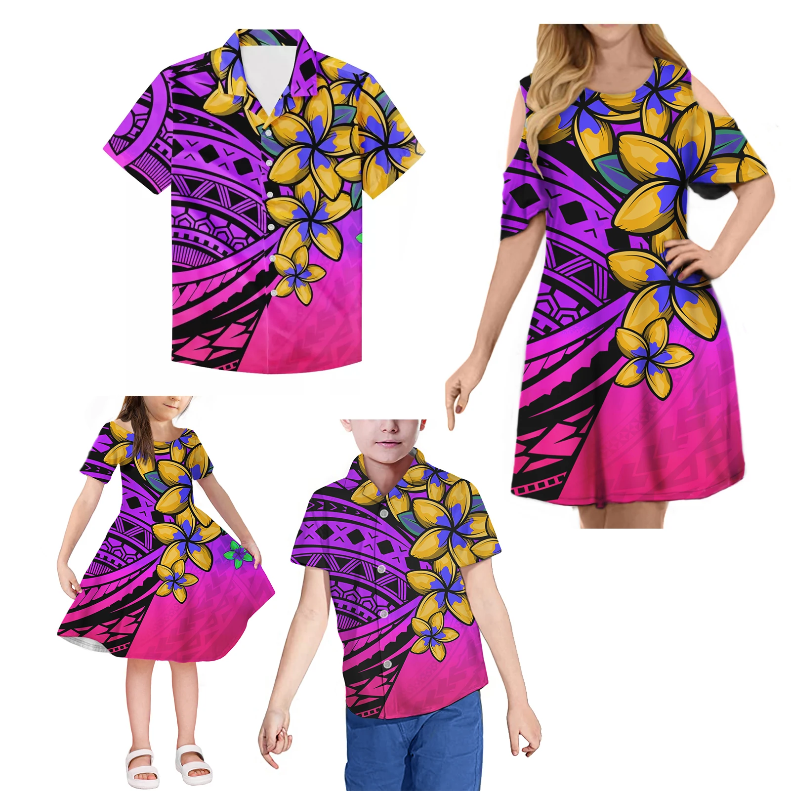 Семейный комплект, одежда для взрослых и детей, комплекты из 4 предметов, красочное женское платье большого размера, индивидуальный дизайн, гибискус, полинезийский этнический дизайн