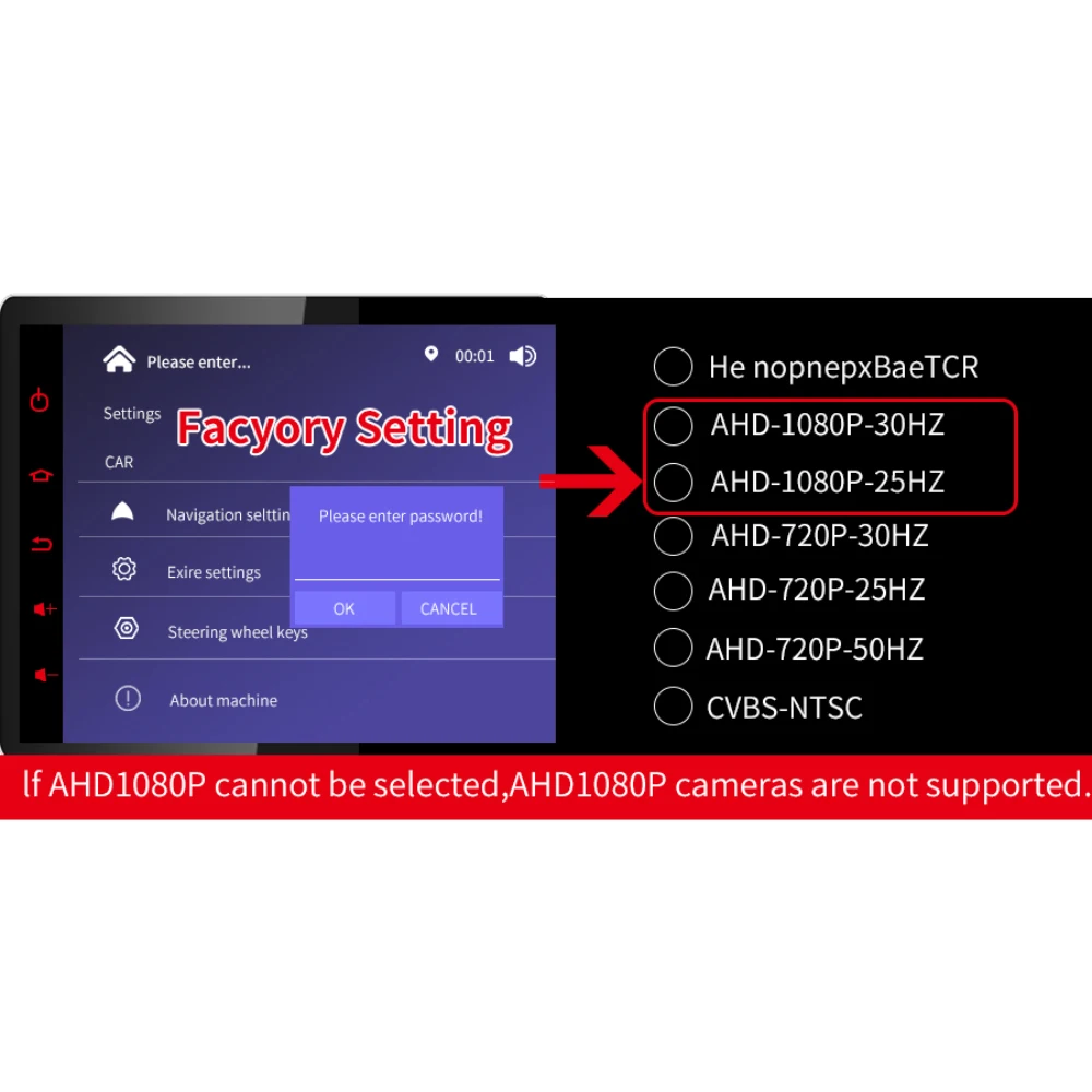 Если AHD не может быть выбран, AHD камеры не поддерживаются!Перейдите к настройкам автомобиля> заводские настройки> Настройки обратного хода (изображение)> Выберите AHD