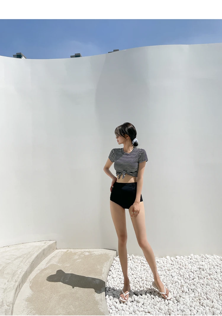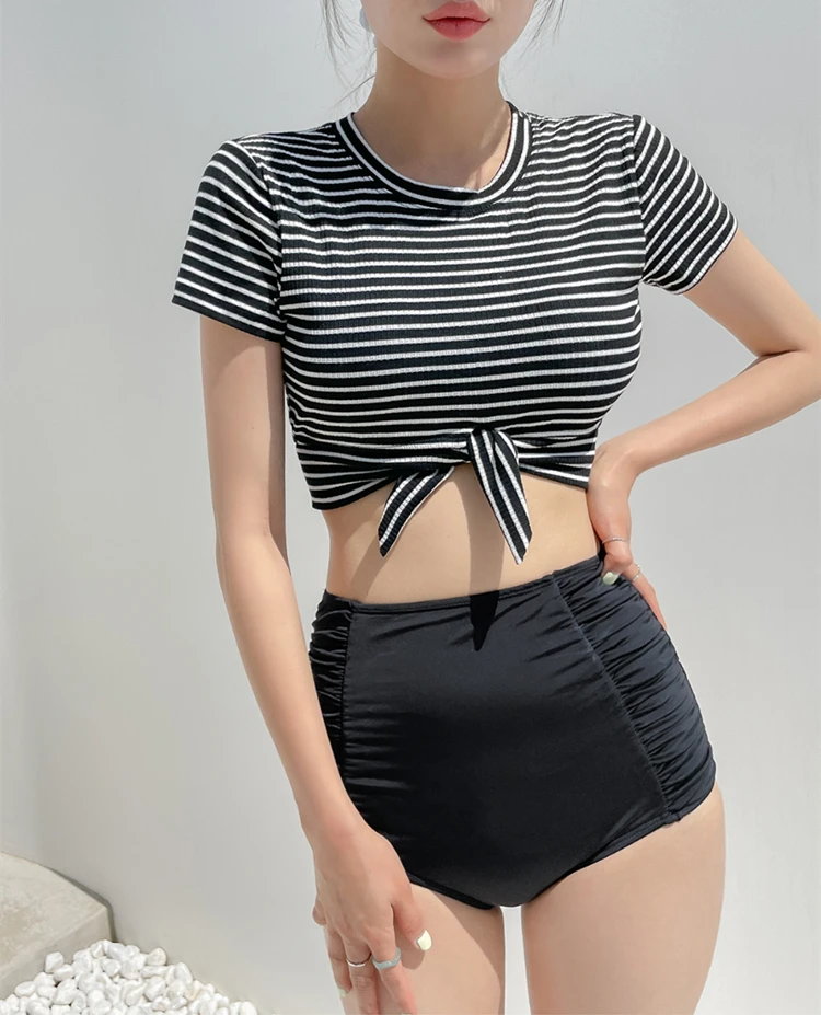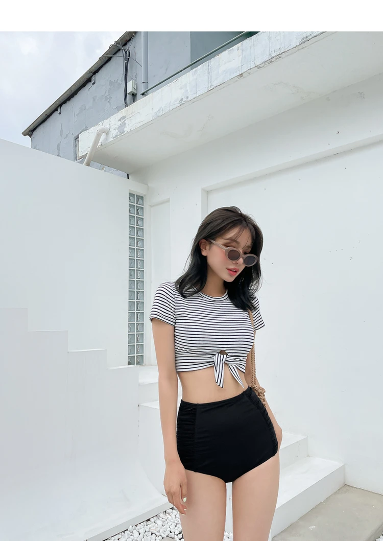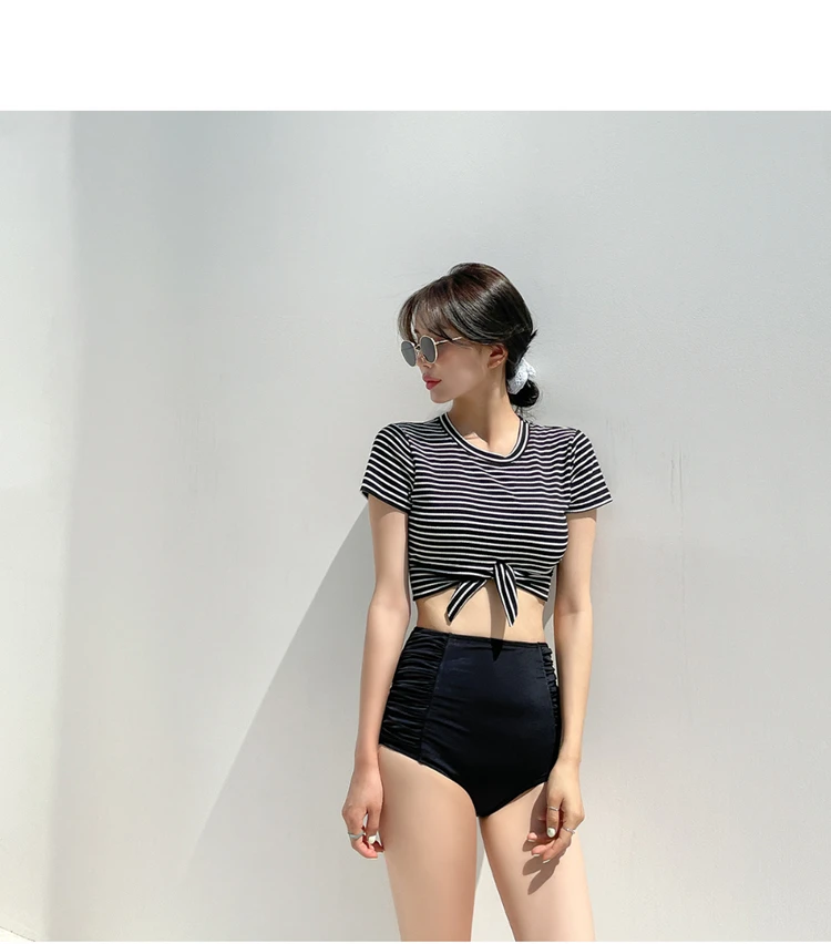 Женский комплект бикини с завышенной талией, женский купальник из двух предметов с коротким рукавом, привлекательный купальный костюм с бантом спереди