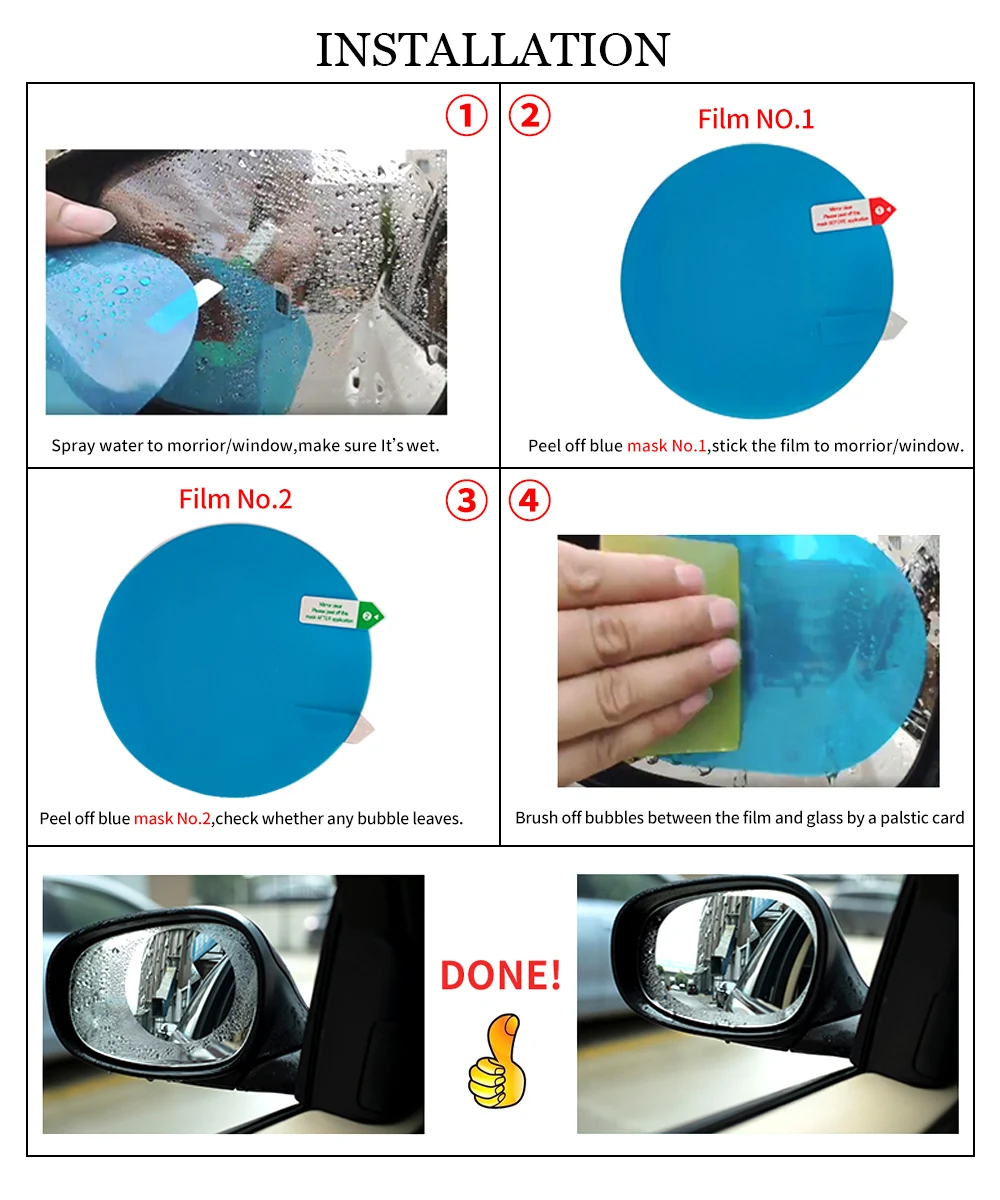 1. 100% новые и высококачественные.2. Универсальная дизайнерская зеркальная защитная пленка заднего вида для автомобиля, внедорожника, грузовика, прицепа и т. д., которая подходит для всех стандартных размеров боковых зеркал.3. Это может уточнить Область обзора для предотвращения возможной опасности, например, помогает вам спроектировать следующее окружение при прохождении или смене полос движения. Он может защитить вашу линию зрения в дождливый день. Это инновация, и она может решить вашу проблему, что вы не можете видеть зеркало reaview четко в дождливый день. Он водонепроницаемый и противотуманный с хорошим эффектом4. Защитите и Защитите боковые зеркала заднего вида от нежелательных царапин, пятен, пыли и грязи, чтобы ваше зеркало заднего вида всегда было чистым. Высокая прочность и высокая пропускаемость5. PET + Nano Защитная пленка с коэффициентом пропускания 99%, анти-туман, Антибликовая, анти-туман, водонепроницаемый, непромокаемый, который эффективно четче вашего зрения и лучше смотреть в дождливый или туманный день.6. Просто потратьте несколько минут, чтобы установить его прямо на зеркало заднего вида, распылите немного воды на зеркало, установите защитную пленку на зеркало и прикрепите его, затем приклейте его небольшим скребком, быстро и легко.