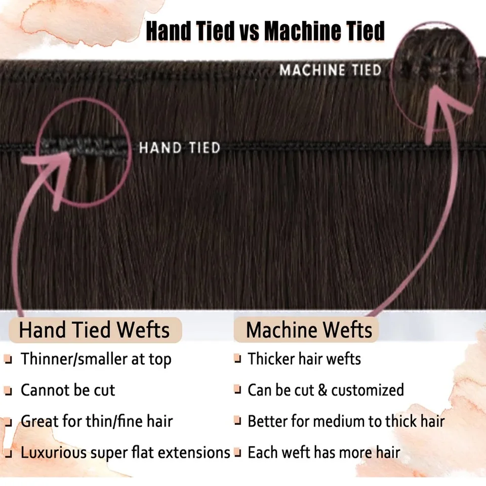 Ручные вязанные утки сшиты вручную, что делает уток волос намного тоньше, чем машинная вязка. При приклеивании к натуральным волосам, завязанные вручную утки приклеиваются к коже головы, чтобы обеспечить естественный вид.Наши супер нарисованные ручные плетения созданы с высокой точностью. Каждый уток очень прочный и предотвращает выпадение, они менее громоздкие и менее заметные. Конечный результат заключается в том, что эти растяжки, связанные вручную, сидят ближе к голове. Ручные утки обеспечивают более естественный внешний вид и объем. Эти характеристики делают ручные утки отличным выбором для более перманентного (сшитого) решения для волос.