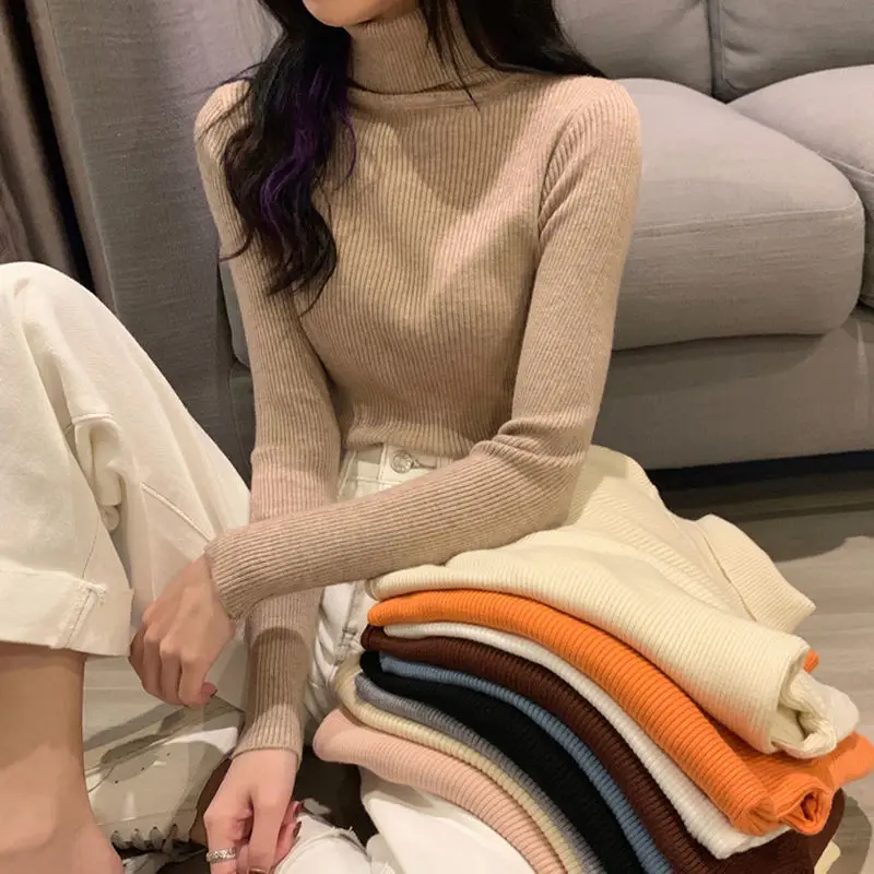 Новинка 2021, женские пуловеры с высоким воротником на осень и зиму, свитер, Женская Базовая рубашка, короткий облегающий плотный джемпер с длинным рукавом, однотонный топ