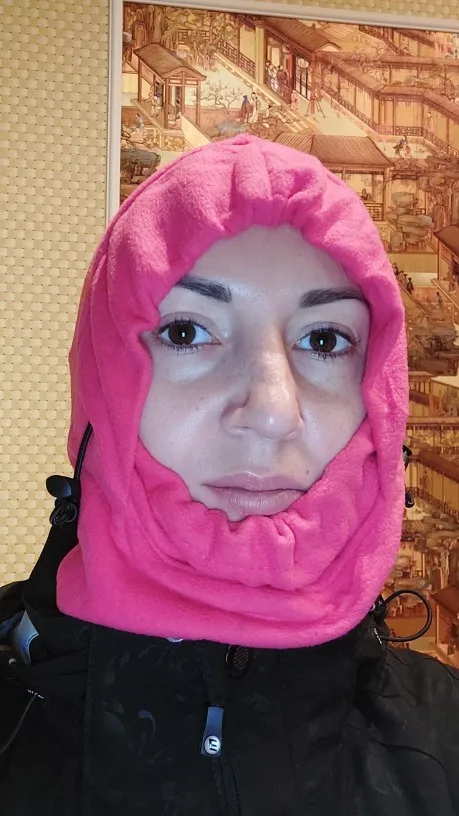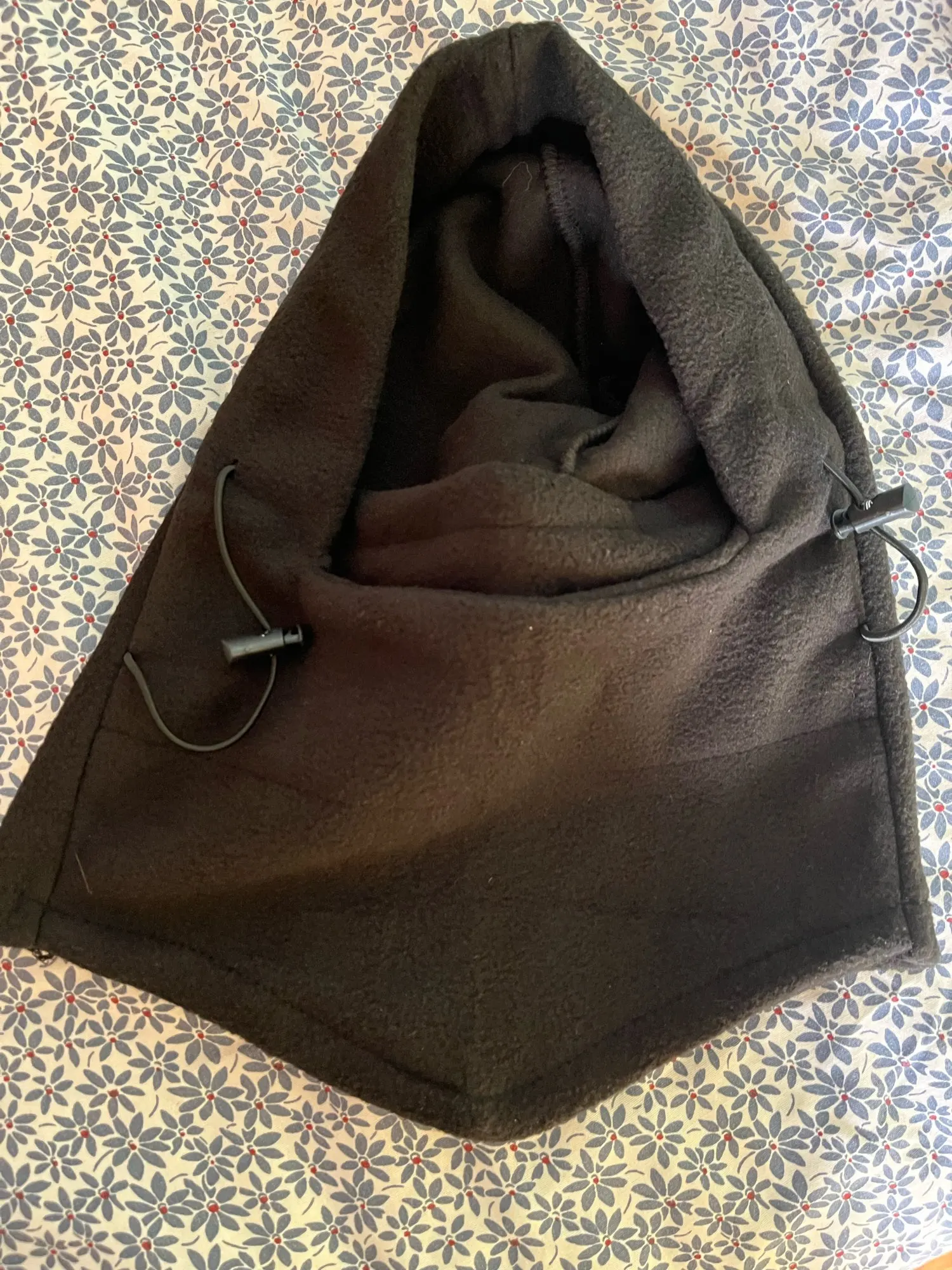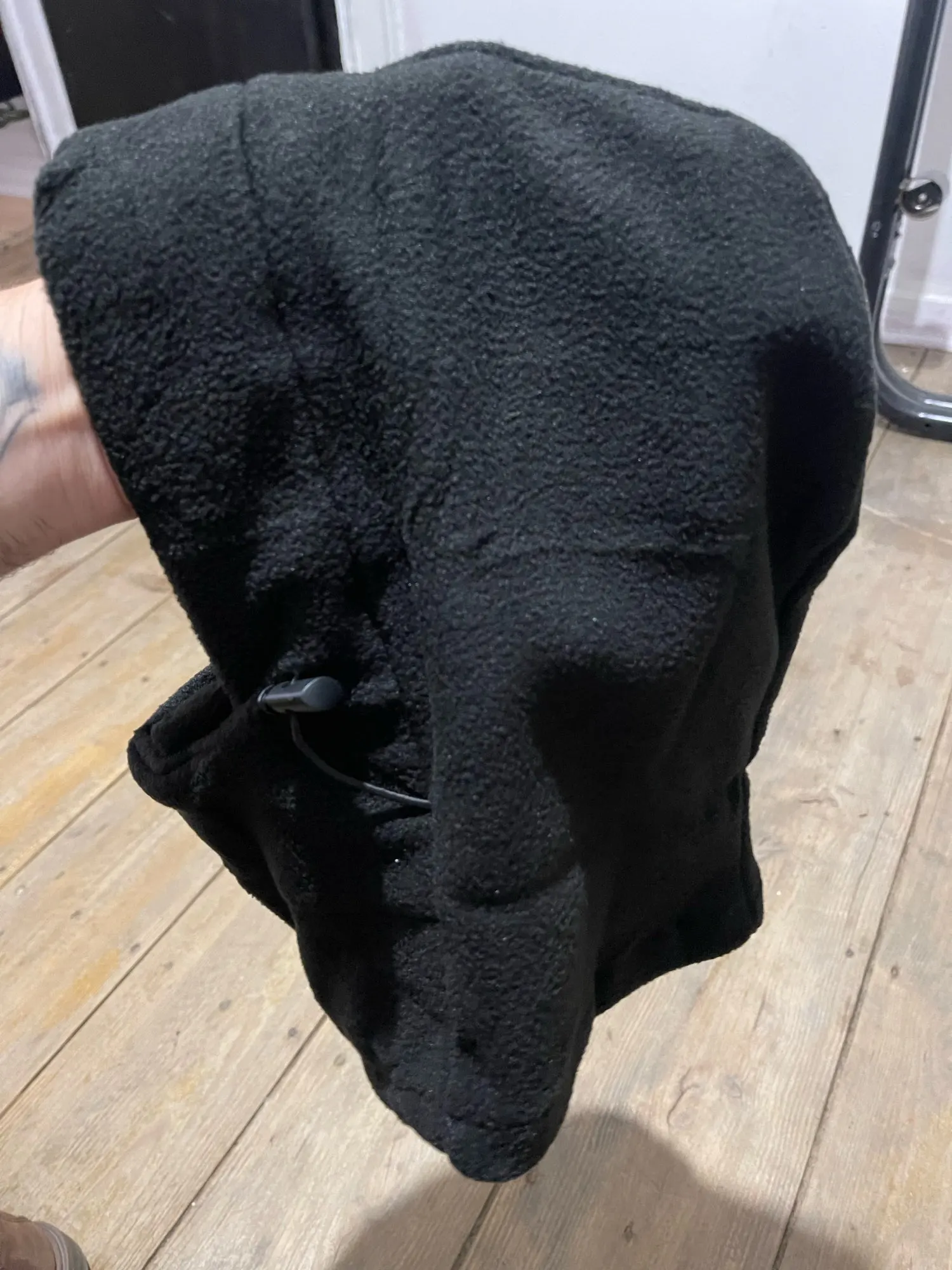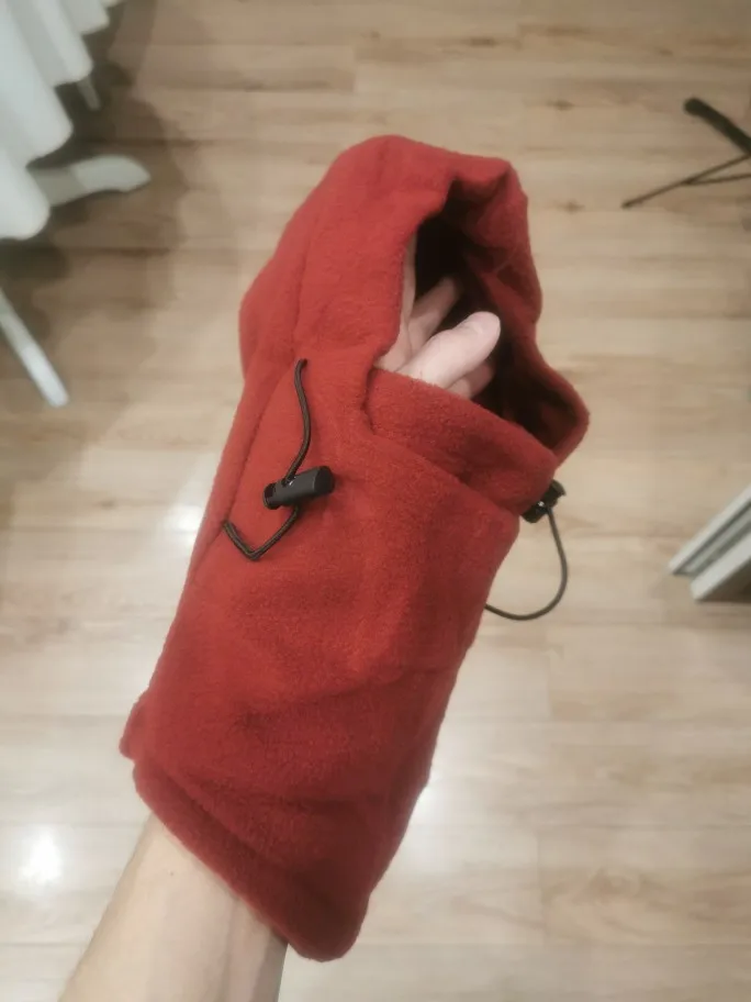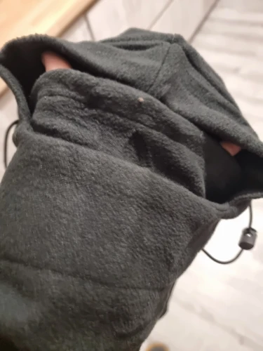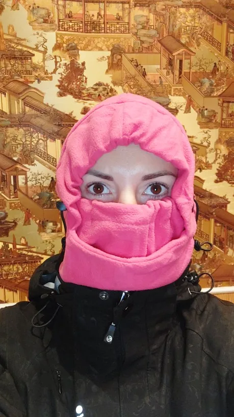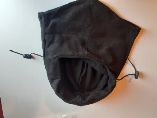 вдоль 32см, поперек 29см. капюшон - 1 слой тонкого флиса. забрало - там куча слоев, честно- так себе конструкция. если так холодно, что надо прикрыть лицо, то это надо только на шапку, а на шапку уже не налезет. ну не знаю, попробуем, когда холодно будет.