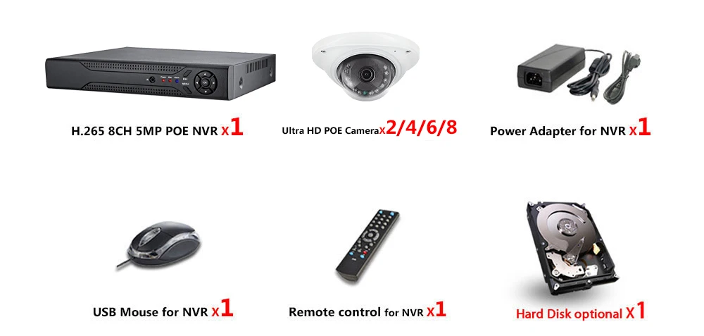 1 сетевой видеорегистратор 8CH 4K POE NVR;2/4/6/8 X HD POE IP 5.0MP для дома и улицы ИК Ночного Видения Всепогодные камеры;1 X Блок питания для NVR;1 х USB мышь для NVR;1 компакт-диск программного обеспечения для NVR;1 пульт дистанционного управления для NVR;Жесткий диск опционально!