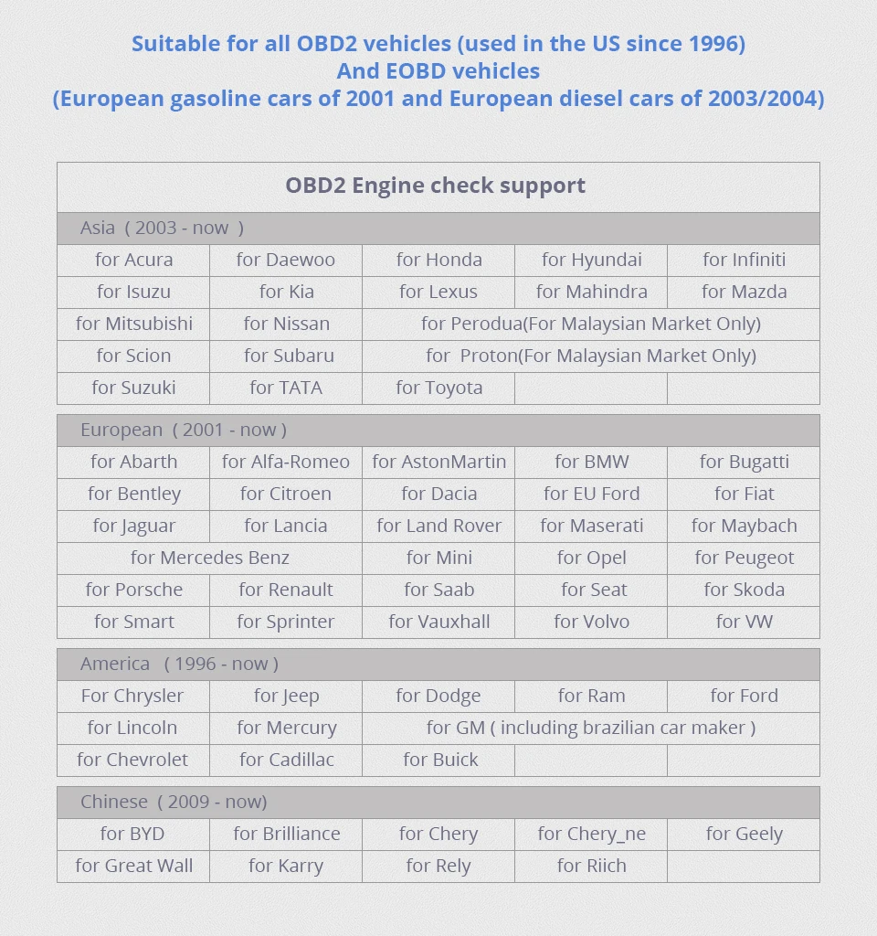 A: Этот ad10 работает для всех моделей автомобилей obd2 после 1996 года. EOBD транспортные средства (европейские бензиновые автомобили 2001 года и европейские дизельные автомобили 2003/2004)