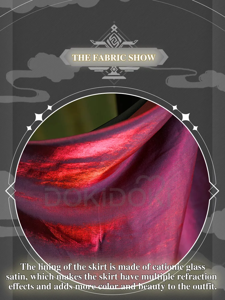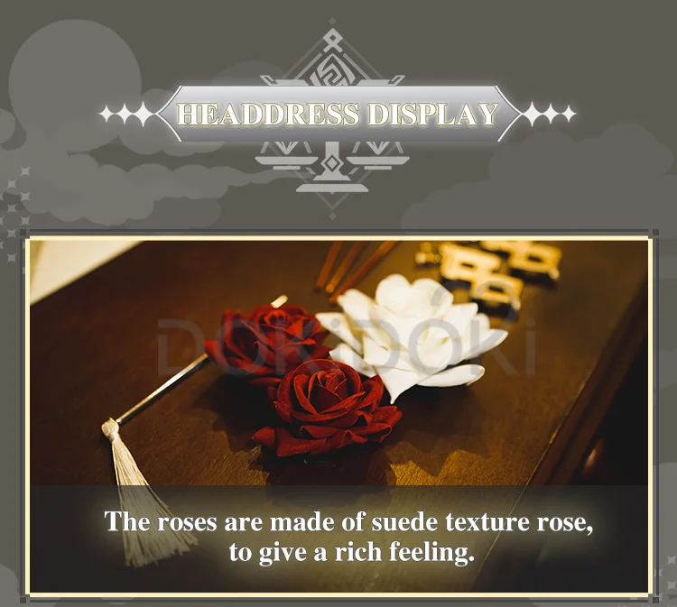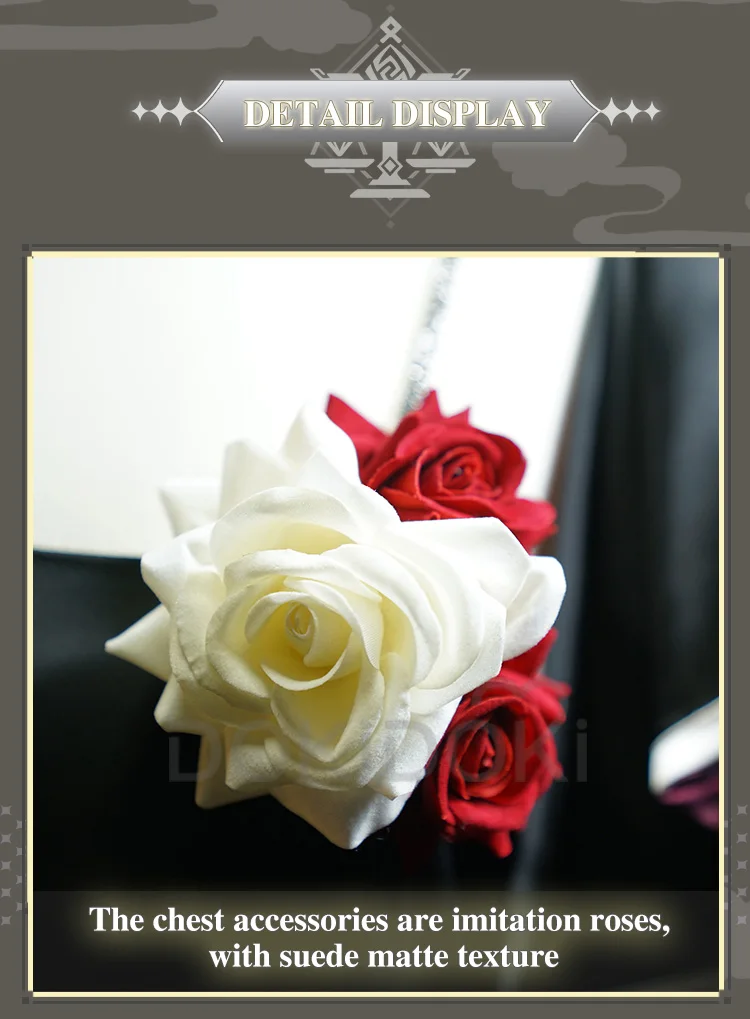 Полный комплект = платье + украшение для плеч + нагрудная розетка + плечевой ремень с бриллиантовой цепочкой + Широкий браслет + тонкий браслет + маска для глаз + перчатки + головной убор роза × 3 + Золотая шпилька × 3 + серьги × 2 + серебряная заколка