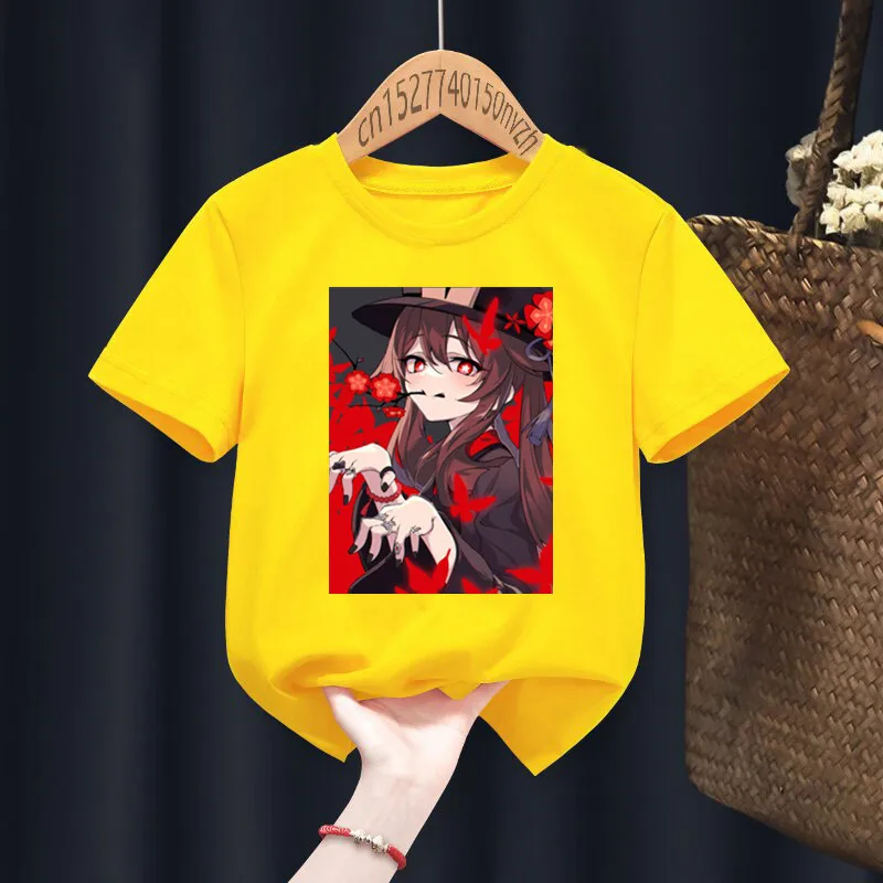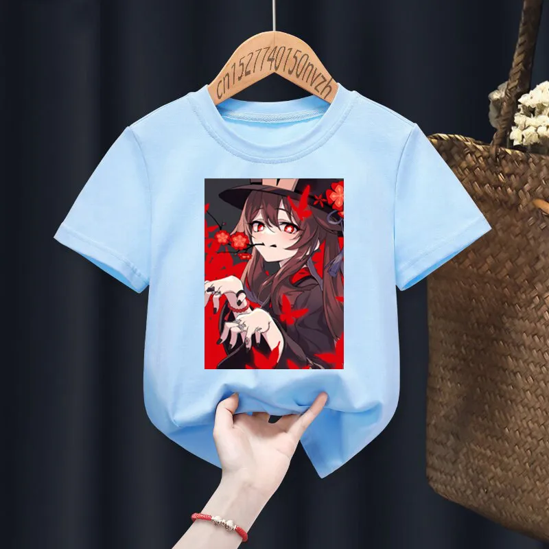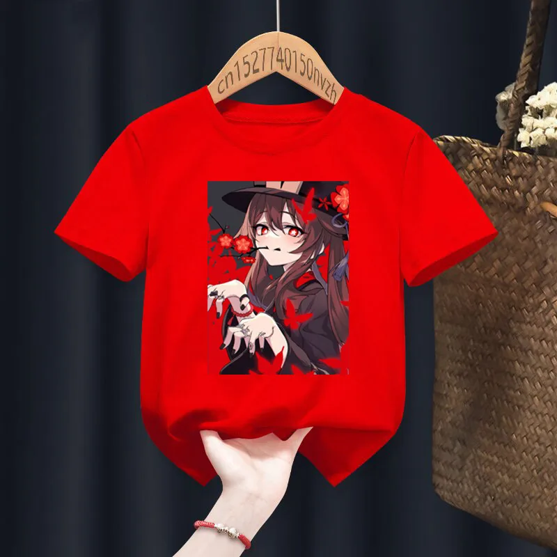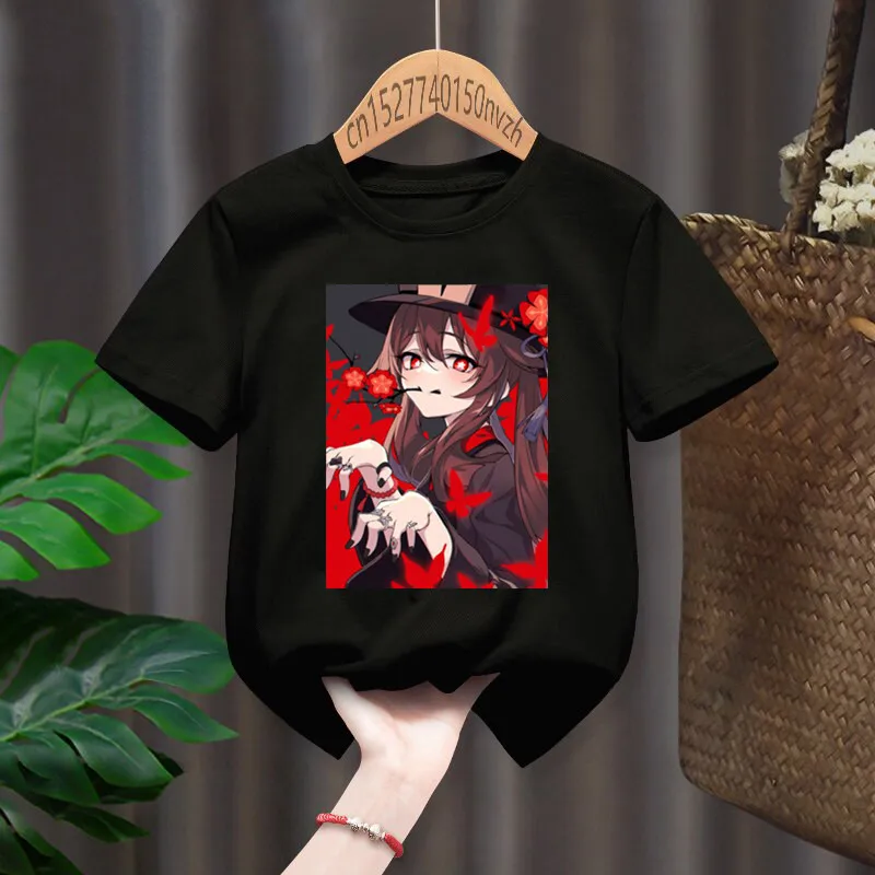 Hu Tao Genshin ударный принт красная фотография детский черный Харадзюку кавайная одежда топы для мальчиков и девочек подарок, Прямая поставка