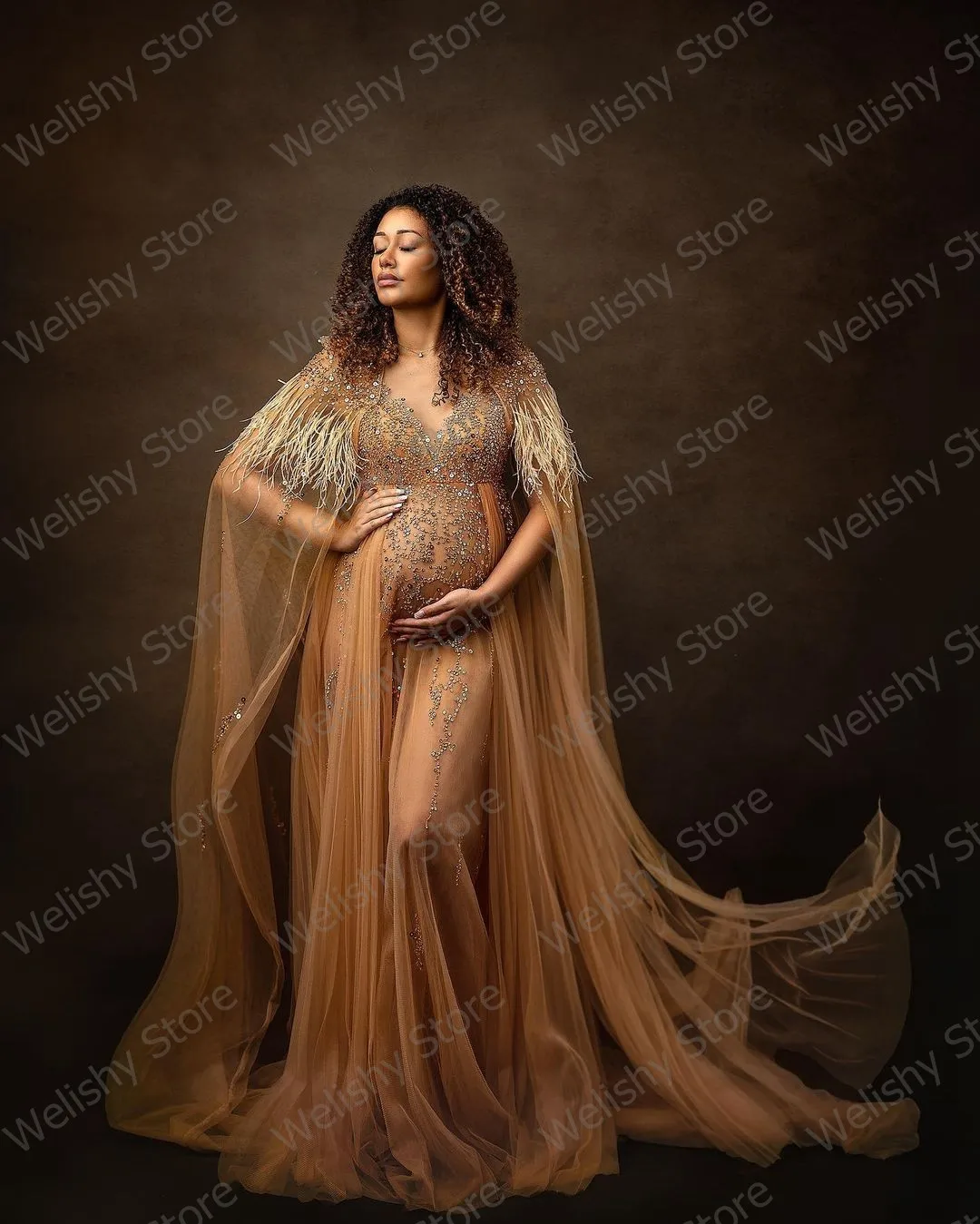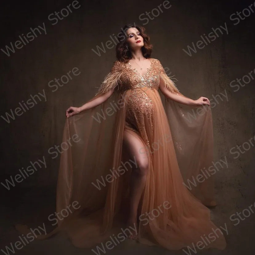 Блестящие тюлевые платья цвета шампанского с блестками для беременных женщин для фотосессии накидка с рукавами и V-образным вырезом платье для беременных с перьями