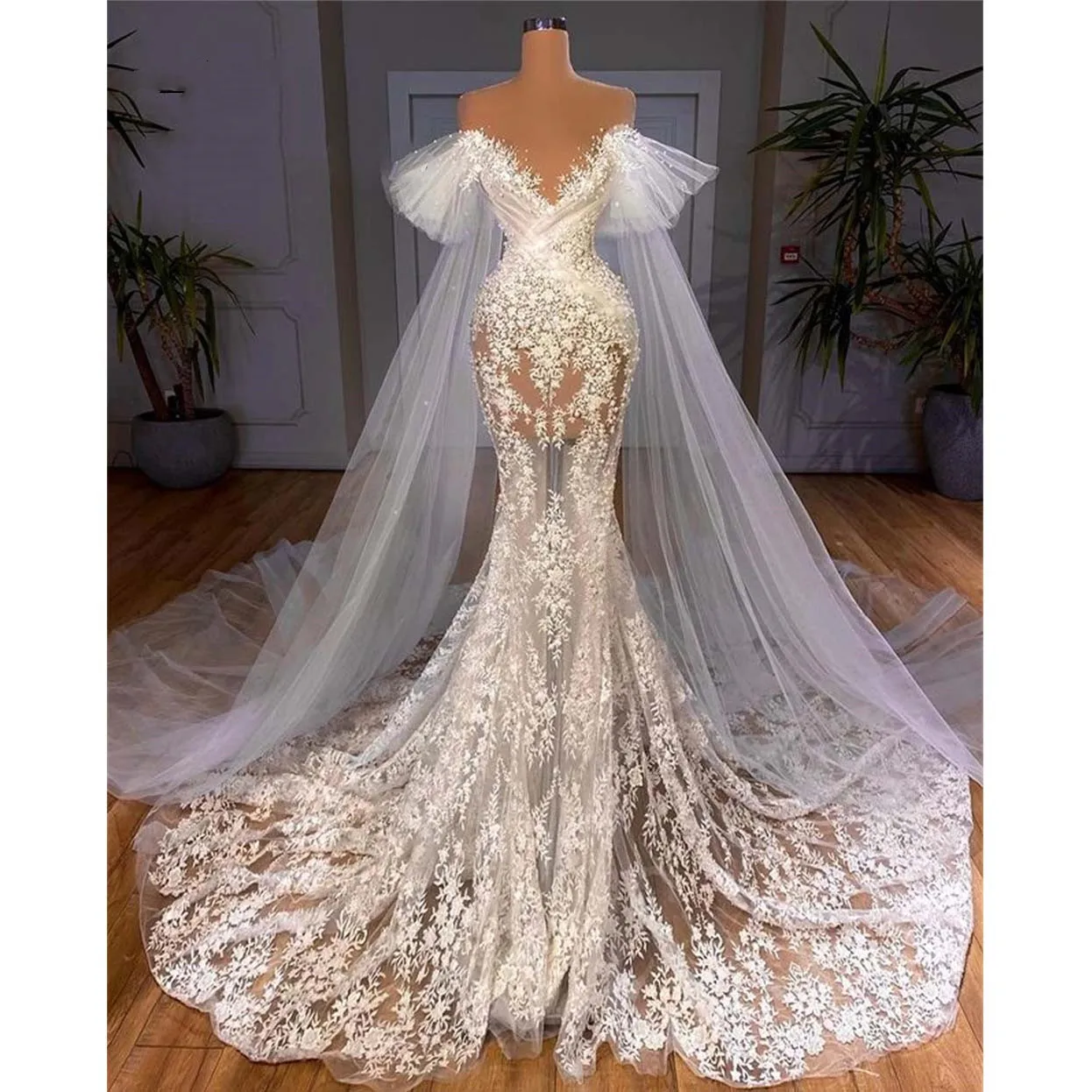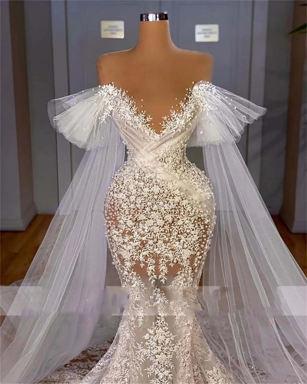 Великолепные кружевные свадебные платья с юбкой-годе 2022, Роскошные свадебные платья с жемчугом и бисером, женское пляжное свадебное платье на заказ