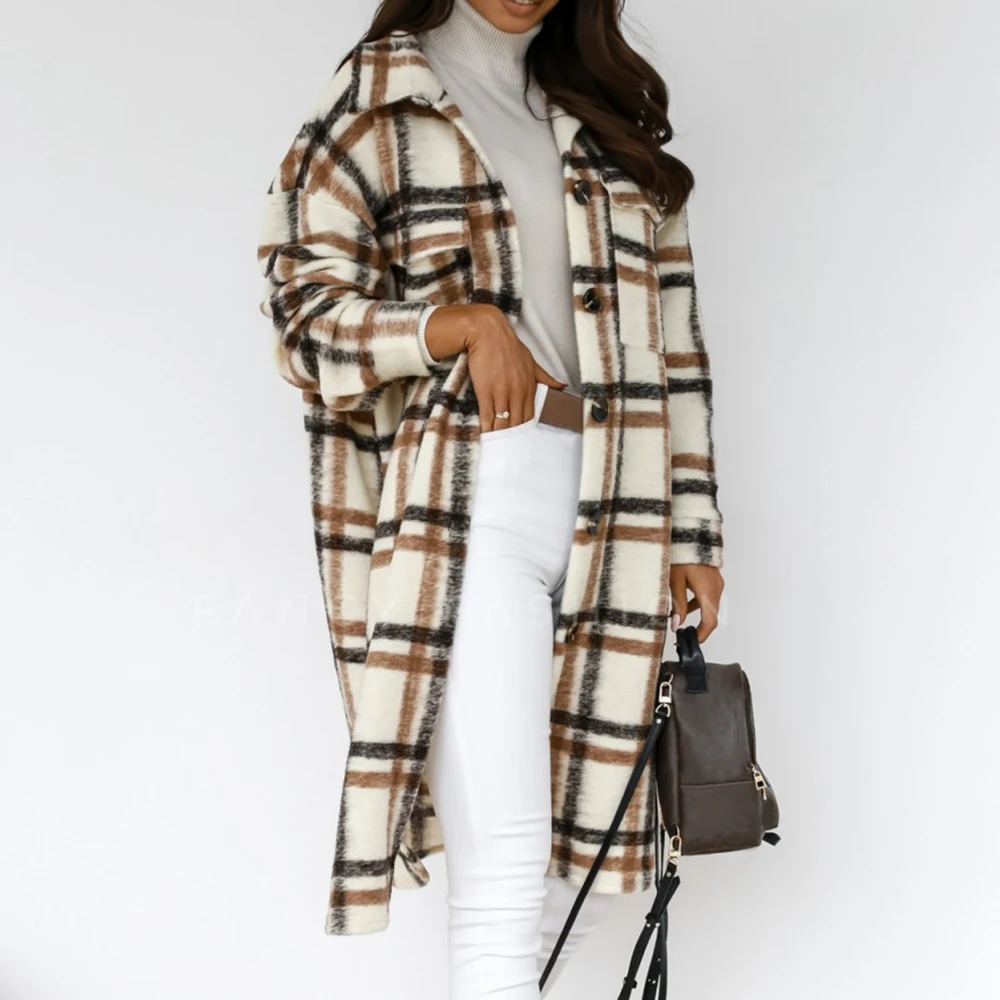 Осень-зима 2021, Женская куртка в клетку, длинное пальто в стиле оверсайз, женская тонкая Повседневная Уличная одежда из шерсти